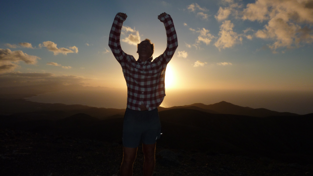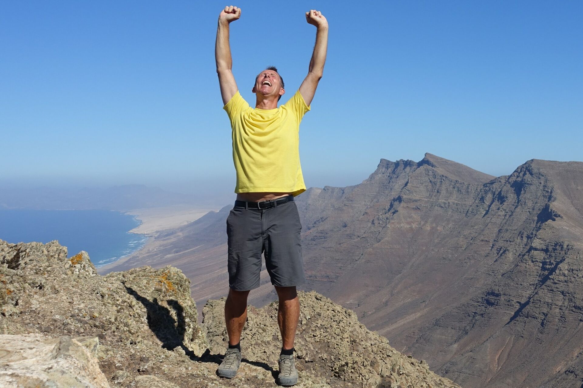 Das Bild zeigt den Gründer von www.gpstrackfinder – Willo -, vor grünen und in den Hochlagen schneebedeckten Bergen, am tiefblauen Wasser und vor der Sonne Griechenlands, Spaniens, des Omans oder Namibia, in der «Siegerpose», oder auch genannt der «Powerpose».