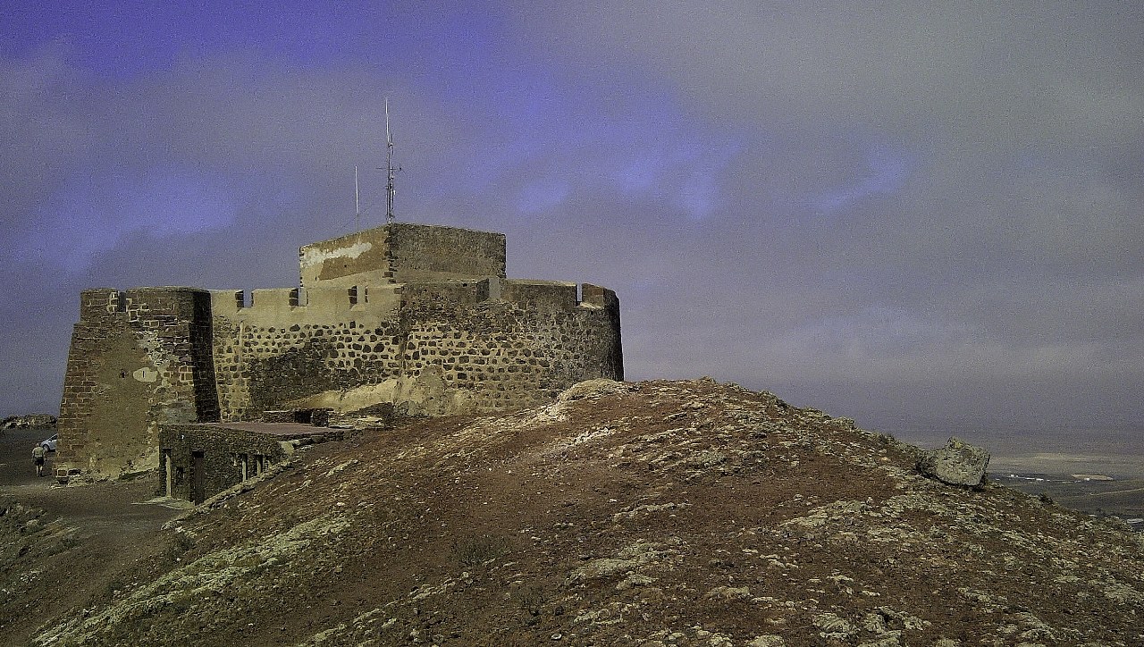Über eine steil ansteigende Straße geht es hoch zur Festungsanlage Santa Barbara direkt auf dem Kraterrand des Vulkans Guanapay auf 442 m Höhe. Von dort oben ergeben sich wunderschöne Blicke auf die Stadt Teguise, sowie die Westküste zwischen den Dörfern Sòo und Caleta de Famara. Die Festungsanlage stellte somit einen erstklassigen Beobachtungsposten dar. Und genau das war die Aufgabe der Festung, Ausschau nach Piraten zu halten und die Einwohner vor Piraten zu warnen. Errichtet wurde die heutige Festung im 16. Jahrhundert, jedoch stand hier bereits im 14. Jahrhundert eine kleinere Festungsanlage. Der Weg ins Innere führt über eine frei stehende Steintreppe mit Zugbrücke. Santa Barbara wurde dann in den siebziger und achtziger Jahren aufwendig restauriert und ab 2011 beherbergt die Festungsanlage Museum über Geschichte der Piraterie. | Siehe Wanderung 35: SONNTAGSTOUR - TEGUISE MARKT ZUR COSTA TEGUISE |