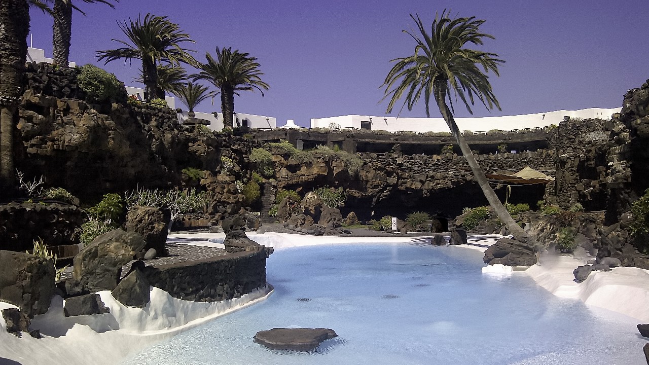 Beim Jameos del Agua handelt es sich um einen erstarrten Lavatunnel, der beim Ausbruch des Vulkans Monte Corona vor etwa 20.000 Jahren entstand. An zwei Stellen sind die Decken eingestürzt, sodass hier Tageslicht eindringen kann. An der ersten Mulde hat sich Salzwasser gesammelt und eine Lagune gebildet, die unterirdisch mit dem Meer verbunden ist. Sie beherbergt einen endemischen blinden Krebs, nach dem die Grotte benannt wurde. An der 2. Lagune befindet sich ein künstlich angelegter Pool, der von César Manrique zu einer Kulturstätte gestaltet wurde. Am Ende des Pools befinden sich ein Auditorium, ein unterirdischer Konzertsaal sowie ein Ballett- und Theatersaal mit natürlicher Akustik. Eine Steintreppe führt vom Pool hinauf zum Museum und Restaurant mit schöner und teilweise überdachter Terrasse, von der man einen Blick in die Grotte auf den Pool und über die weite Lavalandschaft genießen kann. | Siehe Wanderung 18: PUNTA MUJERES - JAMEOS DEL AGUA - CUEVA DE LOS VERDES |