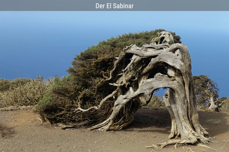 Die mystisch anmutenden Windflüchter Zedernwacholderbäume auf der La-Dahesa-Hochebene sind die berühmtesten Bäume auf der Insel El Hierro. Die kräftig wehenden Passatwinde haben ihr Geäst künstlerisch bis auf den Boden gebogen – ein Naturschauspiel der Extraklasse. Die breite und buschige Strauchform erreicht Wuchshöhen zwischen 3 und 5 m. Diese Bäume wachsen auf El Hierro zwischen 400 und 700 m Höhe und werden bis zu 1.000 Jahre alt. Ihre Rinde ist graubraun bis rotbraun gefärbt. Die verbliebenen Reste eines ehemals ausgedehnten Sabinarawaldes stehen heute unter Naturschutz. Das Gewächs übersteht längere Dürreperioden, da es beständig von Nebel und Wolkenfetzen umströmt wird, die Feuchtigkeit liefern. Der Wacholder ist zwittrig und die weiblichen Pflanzen bekommen die typischen Wacholderbeeren. Vorsicht in der Küche: Es gibt auch giftige Wacholderarten! | GPS-Koordinaten 27.748976 -18.127094 | siehe Wanderungen 15* und 25* |