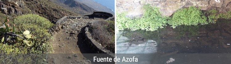 Das üppige Grün der bewaldeten Gebiete von El Hierro führt den Betrachter schnell in die Irre, denn El Hierro war schon immer eine wasserarme Insel und immer wieder gab es Trockenzeiten, die letzte ereignete sich 1948. Die Bevölkerung von El Hierro hat es jedoch verstanden, sich an diese schwierigen Bedingungen anzupassen. Eine der wichtigsten Quellen befand sich im besonders trockenen Osten der Insel zwischen den Ortschaften Los Llanos und Isora. Ein gepflasterter Weg führt zur 729 m hoch gelegenen Fuente de Azofa. Die ursprüngliche Quelle befindet sich nicht unterhalb des großen Platzes, sondern auf der rechten Seite (mit Blick zum Meer). Dort führt ein Pfad zu einer halb offenen Höhle. Selbst nach einer langen Trockenphase versiegt die Quelle nicht. Um die Wasserabgabemenge pro Haushalt zu reglementieren, wurde peinlichst genau Buch geführt. | GPS-Koordinaten 27.748777 ‑17.941270 | siehe Wanderung 23* |