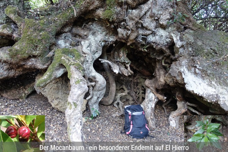 Dieser immergrüne Baum ist in der Regel klein, erreicht eine Höhe von nicht mehr als 4 m und ist etwas gedrungen. In Ausnahmefällen kann er bis zu 10 m hoch werden. Hier, an den geschützten und windstillen Hängen des Caminos Jamina auf El Hierro, wird er sogar sagenhafte 12–15 m hoch. Der Mocanbaum (Visnea mocanera) mit seinen Korkleisten an jungen Ästen gehört zur Pflanzenfamilie der Pentaphylacaceae aus der Ordnung der Heidekrautarten. Die Blätter haben entweder einen ganzen oder einen gezackten Rand, der nicht sehr offensichtlich ist. Zu Beginn des Jahres erscheinen die üppigen Blüten allein oder in kleinen Gruppen und hängen wie kleine Glöckchen am Baum. Diese aromatischen Blüten sind doppelgeschlechtig, mit zahlreichen Staubblättern und 5 cremeweißen Blütenblättern. Die essbare Frucht ist eine fleischige 1–1,5 cm messende Kapsel, die sich im reifen Zustand öffnet und sich von grünlich zu rötlich und schließlich zu dunkelviolett verfärbt. Wer Probleme mit der Bestimmung hat: Im unteren Wegabschnitt sind die prächtigsten Exemplare unübersehbar mit Holzschildern versehen: Mocán de Los Cochinos und Mocán de la Sombra. Die größten Vorkommen befinden sich auf Madeira und den Kanarischen Inseln. | GPS-Koordinaten 27.752767 -17.991433 | siehe Wanderung 26* |