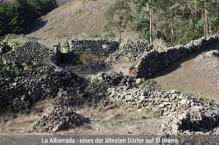 Die meisten Besucher von El Hierro fahren zum heiligen Baum Garoé oder zur Kapelle Virgen de Los Reyes. Nur wenige besuchen die versteckt unter Eukalyptusbäumen gelegenen Ruinen von La Albarrada. In den Chroniken der Insel taucht der Name das erste Mal im 16. Jahrhundert auf. Weitere Einträge folgen im 18. Jahrhundert. Sie beschreiben die sogenannten Apañadas, die auch auf den übrigen Kanarischen Inseln stattfinden. Es handelt sich dabei um ein Zusammentreffen der Hirten, um das halbwilde Vieh zu den sogenannten Gambuesas – das sind abgegrenzte Weidegebiete – zu treiben und dort jedes Tier an den Ohren und im Gesicht zu kennzeichnen. Im Jahr 1860 – zu dieser Zeit hatte die Insel eine Gesamtbevölkerung von 5.026 Einwohnern – wird La Albarrada als ein Weiler beschrieben, der aus zehn Gebäuden bestand, von denen nur eines dauerhaft bewohnt war. Im 19. Jahrhundert erscheint dann La Albarrada nicht mehr in den Chroniken. Was geschah? 1957 schrieb José Padrón Machín, Chronist der Insel El Hierro, dass 1890 ca. 30 Menschen in diesem Dorf zusammenlebten. Durch die zunehmende Entvölkerung blieb nur Pedro Padrón übrig, dessen Haus in Brand gesteckt wurde, womit seine Existenzgrundlage zerstört war. Er verließ das Dorf. Die verbliebenen strohbedeckten Häuser holte sich schnell die Natur wieder. | GPS-Koordinaten 27.780354 ‑17.946732 | siehe Wanderung 30* |