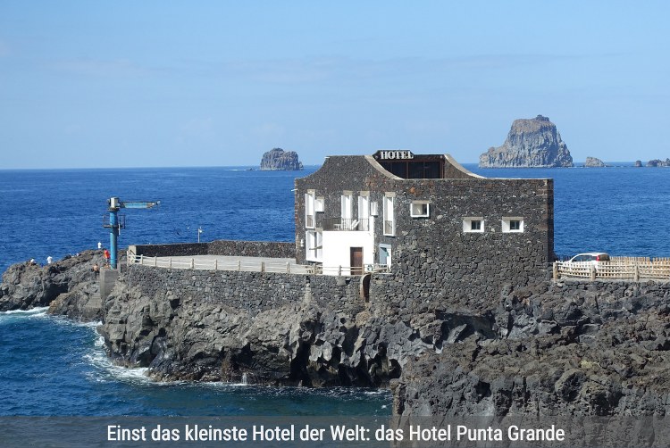 Das Hotel Punta Grande liegt spektakulär auf einer Klippe mit einem fantastischen Ausblick auf den Atlantischen Ozean und das El-Golfo-Tal. Das Gebäude, in dem sich heutzutage das Hotel befindet, wurde 1830 erbaut und mauserte sich schon bald zum Handelszentrum im El-Golfo-Tal. Zu Beginn des 20. Jahrhunderts wurde der Kran zur Entladung von Versorgungsschiffen ergänzt. 1975 wurde es komplett renoviert, unter anderem wurden Maßnahmen zur Wahrung der Sicherheit bei Stürmen durchgeführt. 1984 ging das Hotel als kleinstes Hotel der Welt ins Guinnessbuch der Rekorde ein, 2019 wurde es von der kanarischen Regierung zu einer Sehenswürdigkeit von kulturellem Interesse erklärt. Das Hotel besitzt 4 Zimmer und 6 Bungalows, die alle freundlich und individuell eingerichtet sind. Der Gast blickt von den Zimmern direkt auf den Atlantischen Ozean, die ionen- und jodhaltige Ozeanluft ist im Preis inbegriffen. Restaurants befinden sich in unmittelbarer Nähe, Geschäfte im 2 km entfernten Ort Tigaday. Das Naturschwimmbad von La Maceta ist ca. 10 Autominuten entfernt. | Webseite Hotel | GPS-Koordinaten 27.797136 -17.992084 | siehe Wanderung 32* |