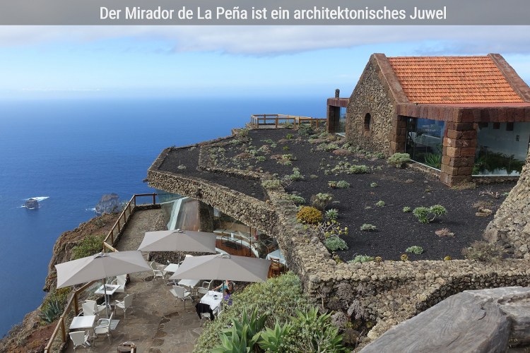 Das Gebäude des Miradors de La Peña ist ein architektonisches Juwel des spanischen Malers, Architekten, Bildhauers und Umweltschützers César Manrique, der hauptsächlich auf der Insel Lanzarote tätig war, aber auch verschiedene Projekte auf Nachbarinseln umsetzte. An einem wunderschönen Aussichtspunkt über das El-Golfo-Tal entstand ein Gebäude über mehrere Etagen mit großen Fensterfronten. Es zeichnet sich durch einen faszinierenden Blick über das El-Golfo-Tal sowie eine minimalistische Innenarchitektur und Raumausstattung aus. Im Inneren des Gebäudes verwöhnt das hauseigene Restaurant mit Köstlichkeiten der regionalen Küche, die allesamt mit frischen Produkten aus lokaler Produktion hergestellt werden, so zum Beispiel mit Ananas aus El Hierro oder frischem Fisch aus den Gewässern vor der Insel. Der Mirador wurde am 17. Juni 1989 eröffnet und bereits 2001 von der kanarischen Regierung in die Liste der historischen Monumente aufgenommen. | GPS-Koordinaten 27.806973 -17.980803 | siehe Wanderungen 45* und 48* |