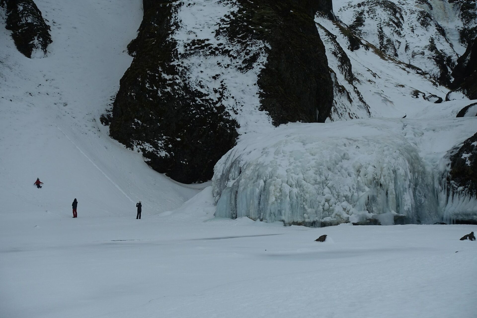 Island – Der eingefrorene Stjórnarfoss hat eine Höhe von ca. 15 m.