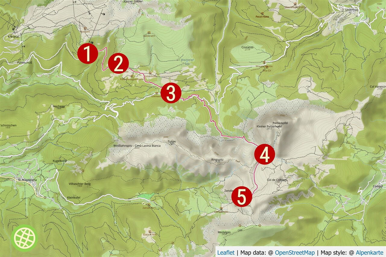 Nach ca. 2 km zweigt halb rechts die Schotterpiste zur 02 Schatzerhütte (2.004 m) ab. Wer keinen Espresso zur Stärkung benötigt, geht geradeaus weiter. Bei der darauffolgenden Gabelung der beiden Pisten gehen wir nicht halb links bergauf, sondern halb rechts. Nach einigen Metern mündet von links ein Pfad in den unsrigen. Es handelt sich hierbei um die Tour 31, die Hauptroute des Dolomitenhöhenweges Nr. 2. Die nächsten zwei rechten Abzweiger ignorieren wir, um dann am dritten Abzweiger rechts Richtung Peitlerscharte zu gehen, nun auf dem Wanderweg 4.