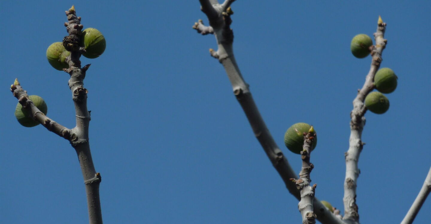 Vom (01) Start und Ziel (321 m) gehen wir 130 m auf der Straße Richtung Embona, um dann bei den Weinreben scharf rechts auf die Schotterpiste abzubiegen und dieser entlang der vielen fruchtbaren Felder nun bergab zu folgen. Die Wirtschaftswege nach rechts und links ignorieren wir, bis ein Bachbett die Straße gequert hat und wir nach einem kurzen Anstieg eine Weggabelung erreichen.