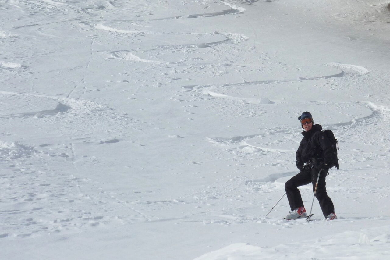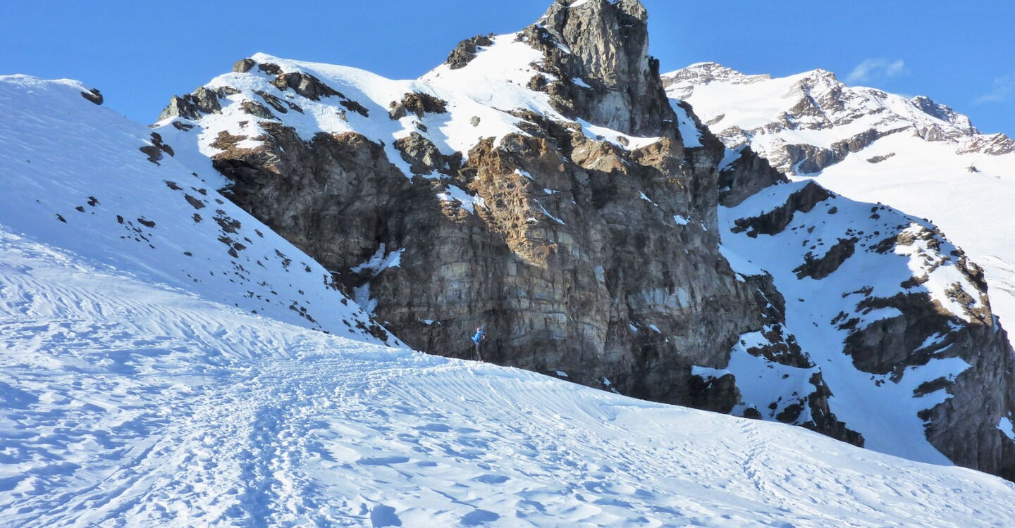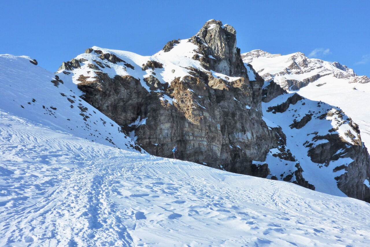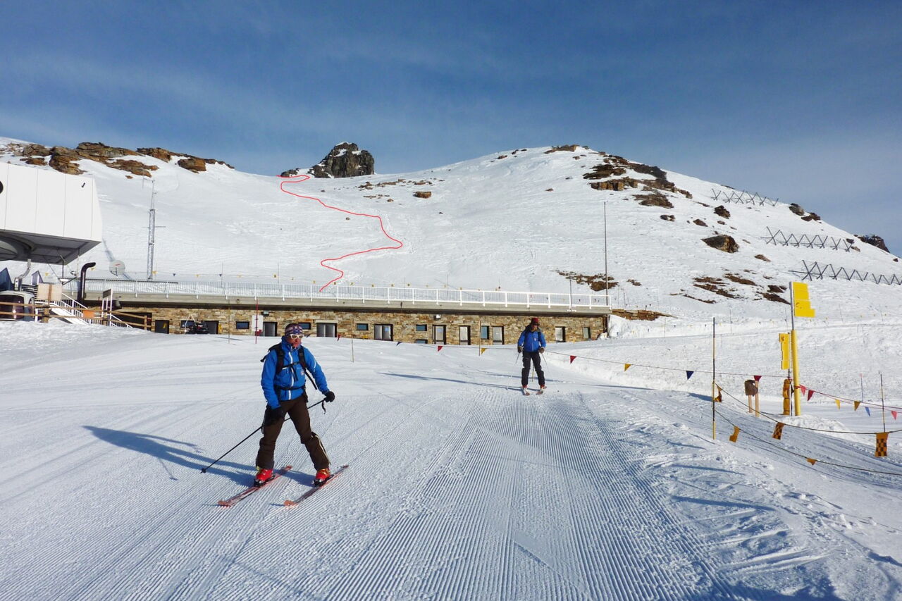Nach einem kurzen Aufstieg und einer Abfahrt mit dem Ziel vor Augen kommt man wieder ins Skigebiet zurück. Die Abfahrt führt über einen Osthang. Folgende Ausrüstung wird empfohlen: Produkte für alpine Sicherheit im Schnee, Freerideski und Skitourenhelm. Es gibt keine Einkehr auf der Tour. Außer man nimmt vor oder nach der Tour eine Stärkung in dem Rifugio Città di Vigevano. Beste Jahreszeit: Januar bis April. Uns erwarten kurze Stücke mit bis zu 30° Hangneigung.