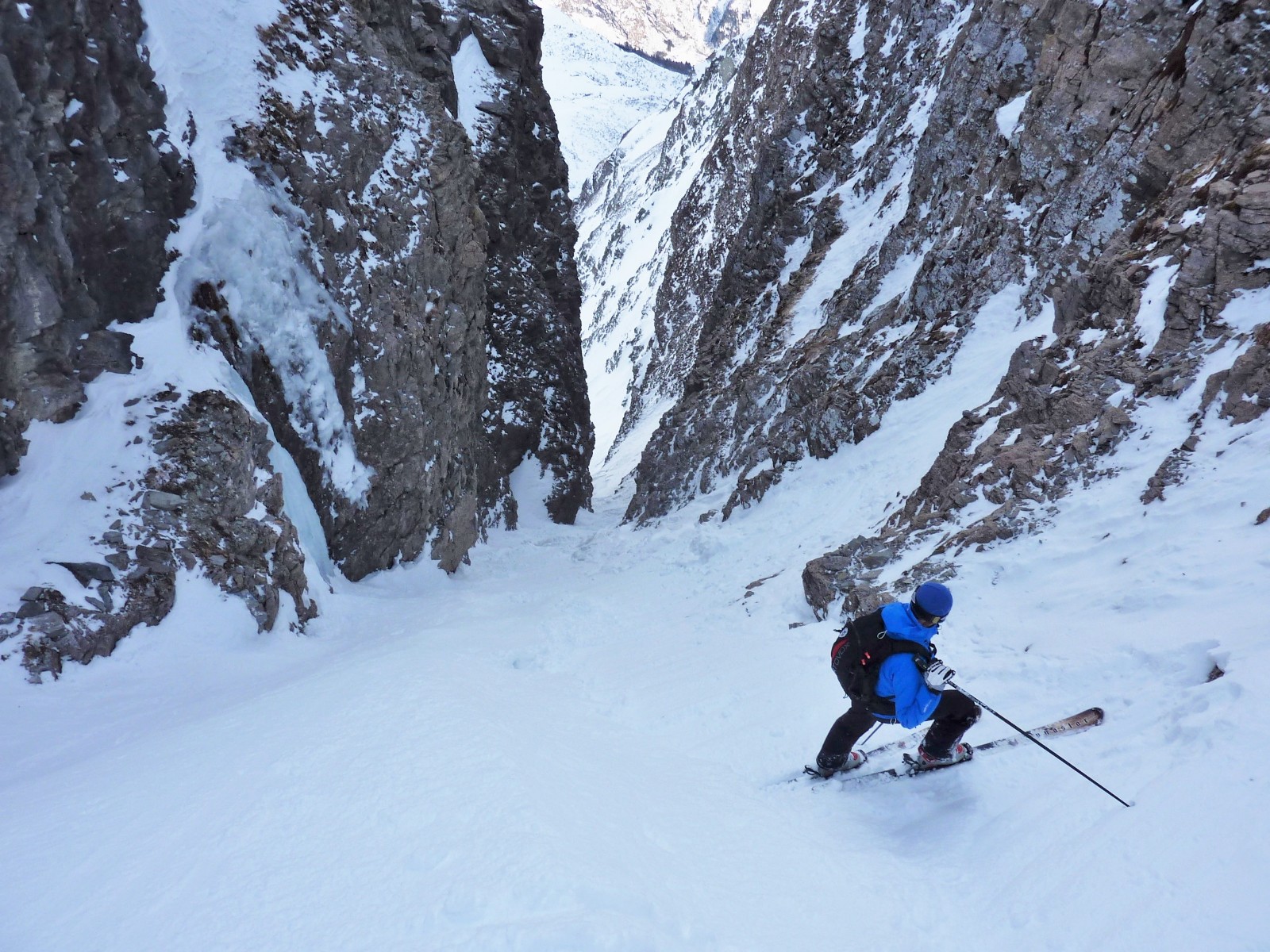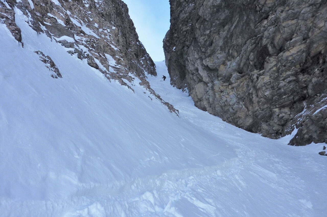 Wir fahren ins andere Tal hinunter. Nach ca. 800 m gilt es Ausschau zu halten nach dem Einstieg in die 500 m lange und steile Scharte.