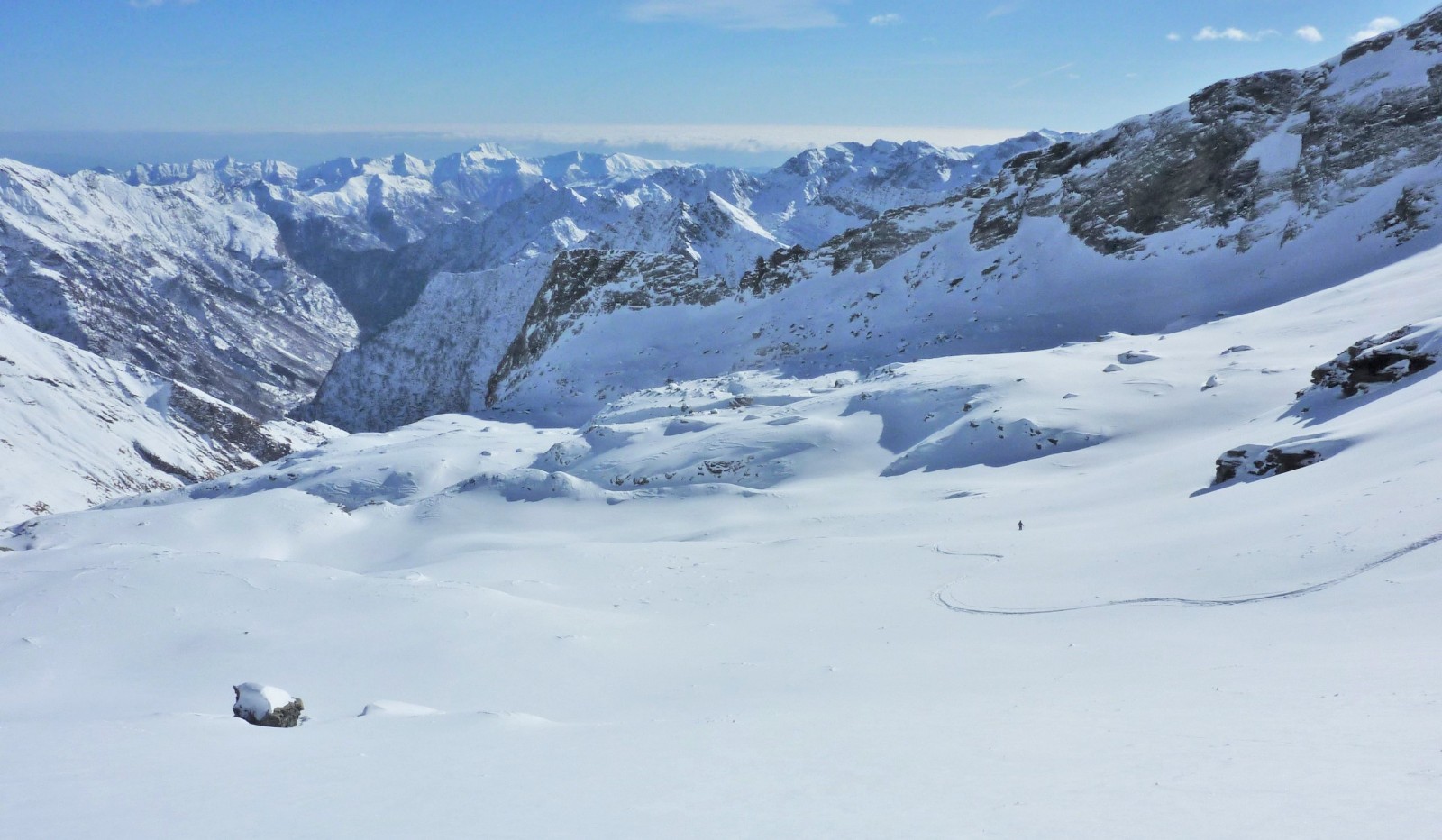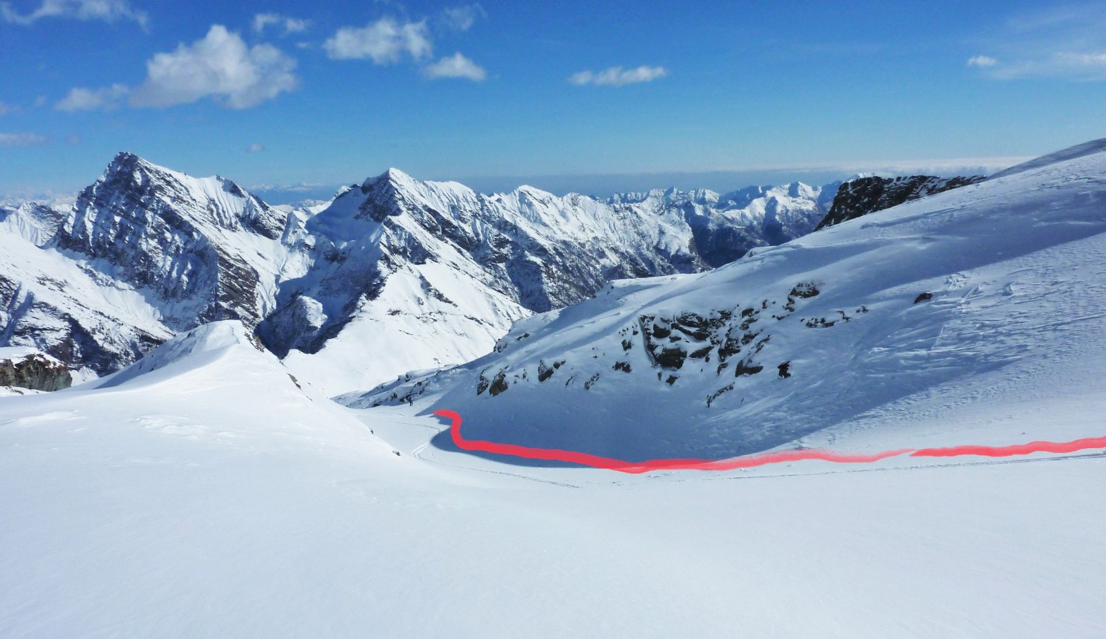 Der Einstieg zum Aufstieg ist nicht leicht zu finden. Sonst ist mithilfe des GPS-Tracks auf der Abfahrt die Orientierung einfach. Die Abfahrt führt über einen Südosthang. Folgende Ausrüstung wird empfohlen: Produkte für alpine Sicherheit im Schnee, Freerideski und Skitourenhelm. Es gibt keine Einkehr auf der Tour. Außer man nimmt vor oder nach der Tour eine Stärkung in dem Rifugio Città di Vigevano. Beste Jahreszeit: Januar bis Mitte März. Uns erwarten kurze Stücke mit bis zu 35° Hangneigung.
