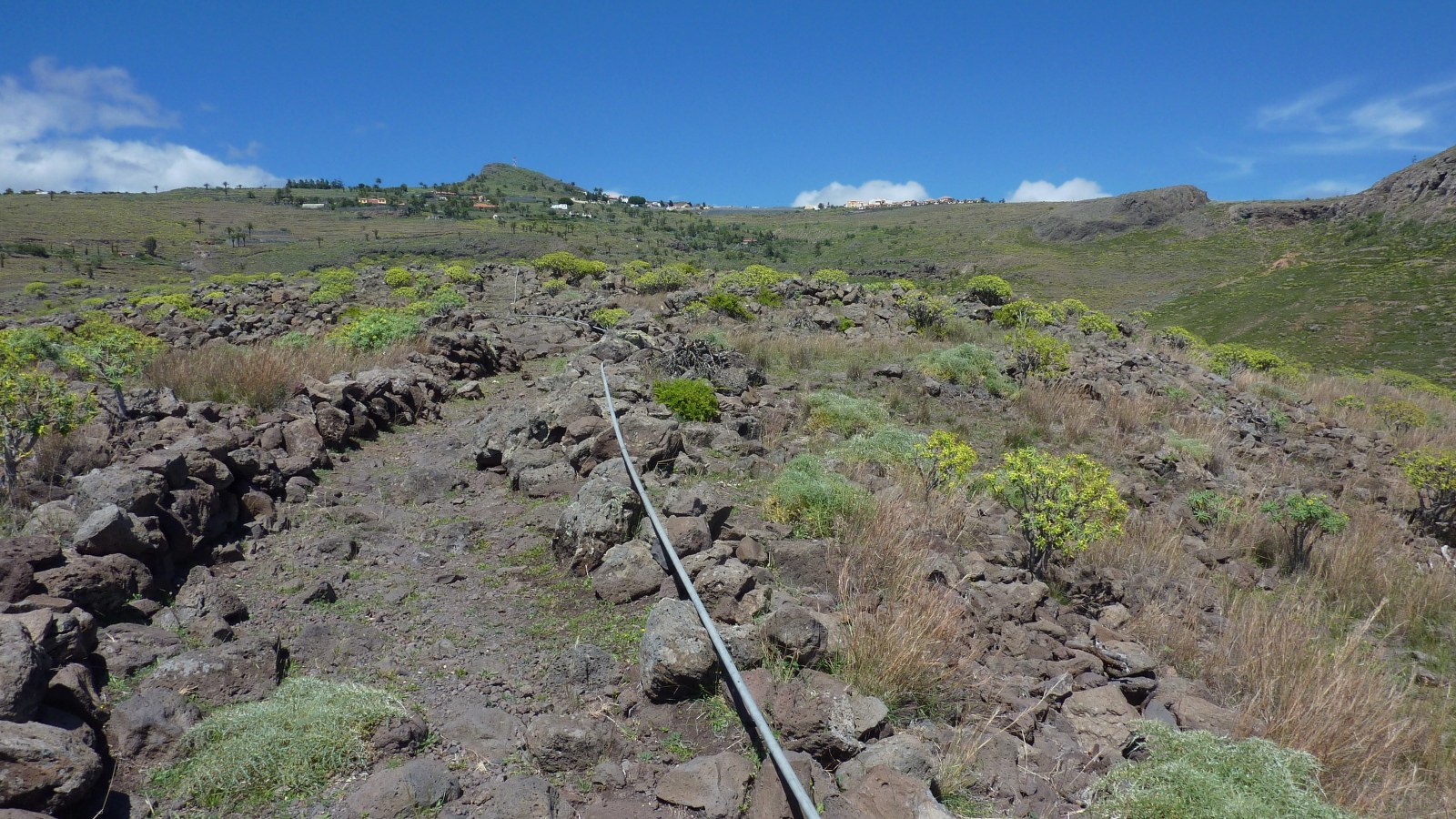 Nach 80 m folgen wir rechts der Ausschilderung Richtung (02) Ermita de San Isidro Labrador (803 m), bis wir auf einen Parkplatz treffen. Nach weiteren 500 m auf einem gepflasterten Weg haben wir den Mirador de Tagaragunche auf der Montaña del Calvario 806 m und die Ermita de San Isidro Labrador erreicht. An dieser Stelle wachte ein Posten, um nach Piraten Ausschau zu halten oder in Kriegszeiten vor Angreifern zu warnen. Bei guter Sicht ergeben sich atemberaubende Fernblicke: Im Osten angefangen sieht man den Teide auf Teneriffa, bei besonders guter Sicht Gran Canaria, San Sebastián, den Flughafen von La Gomera, die vorgelagerten Bergrücken auf La Palma und El Hierro. Nach dem Abstieg, wir befinden uns bereits auf der Asphaltstraße, biegen wir nach 80 m auf den links beginnenden Pfad ab. Auf dem Camino verlieren wir schnell an Höhe und befinden uns jetzt direkt unterhalb der Montaña del Calvario.