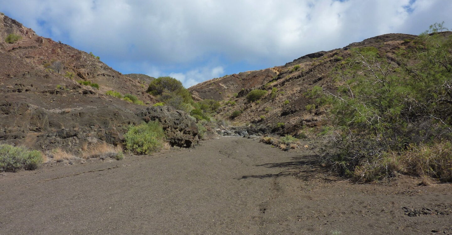 Wir steigen in das Barranco hinab und befinden uns unterhalb der (02) Caseria Cubada (128 m). Zwischen dem Barranco mit Palmen und einer hohen Steinmauer verläuft der Wanderweg ein kurzes Stück rechts. Im weiteren Verlauf geht es über die Terrassenfelder bis zu einer Weggabelung. Wir steigen links direkt im Barranco auf, bis wir auf eine Betonplatte treffen, die mit einem Steinmännchen markiert ist. In westlicher Richtung - oberhalb der links von uns liegenden Häuser - macht der Pfad nach 300 m eine Rechtskurve. Wir erreichen ein großes Wasserauffangbecken, an dem wir rechts in das breite und sandige Barranco steigen.