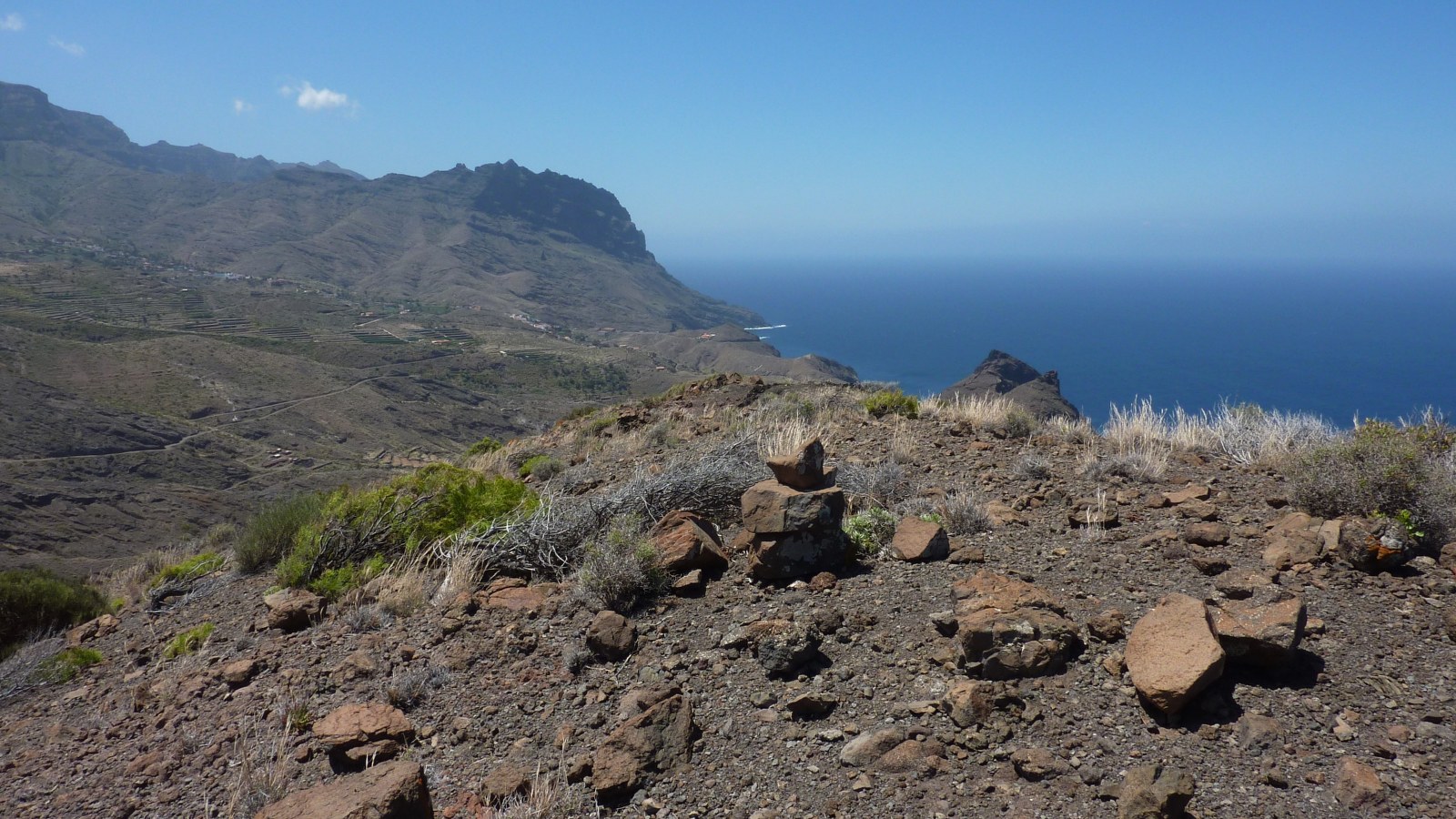 Wir wandern in östliche Richtung auf dem felsigen Bergrücken weiter bergauf, um dann auf einem Höhenzug - mal bergauf, mal bergab - an einer quadratisch gebauten Ruine vorbeikommen. Kurz vor dem Gipfel des Pico de Herrera gehen wir über hellbraunes Gestein und beginnen links unterhalb des Gipfels zu queren - bei einem Steinmännchen -, bis wir die Einsattelung (04) unterhalb des Pico de Herrera (380 m) erreicht haben. 100 m nördlich des Gipfels führt rechts ein schmaler Pfad in das Barranco hinab, der intensiv mit Steinmännchen markiert ist. Kurz nach einem kleinen Bergrücken quert er ein Barranco und bei einem Steinmännchen queren wir abermals nach rechts ein Barranco, um dann links bis zur Schotterpiste aufzusteigen.