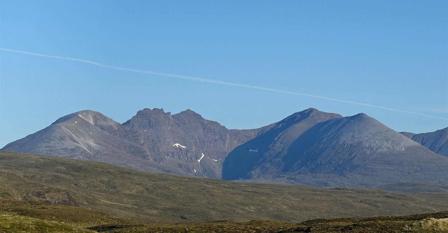 Vom 01 Parkplatz (89 m) gehen wir auf dem Seitenstreifen der A832 Richtung Dundonnell. Den rechten Abzweiger am roten Briefkasten ignorieren wir und gehen geradeaus weiter, um hinter einem Bungalowpaar nach 3,8 km auf einem links abzweigenden Pfad den Aufstieg zu beginnen. Nach 5 km gehen wir bei einem Steinmännchen nicht geradeaus weiter, sondern folgen dem rechts abzweigenden und weniger sumpfigen Pfad. Der geradeaus weiterführende Pfad ist die neue Route, aber weitaus sumpfiger! In engen Kehren führt der Pfad bergauf und wir genießen eine traumhafte Aussicht auf den sich vor uns erhebenden felsigen Grat des Meall Garbh. Auf dem nachfolgenden Bergrücken mit platt geschliffenem Sandgestein verliert sich die Spur des Pfades. Wir steigen nun parallel zum unterhalb liegenden Tal mit dem neuen Wanderweg zu einer Anhöhe, dem sogenannten Sron A‘ Choire, auf.