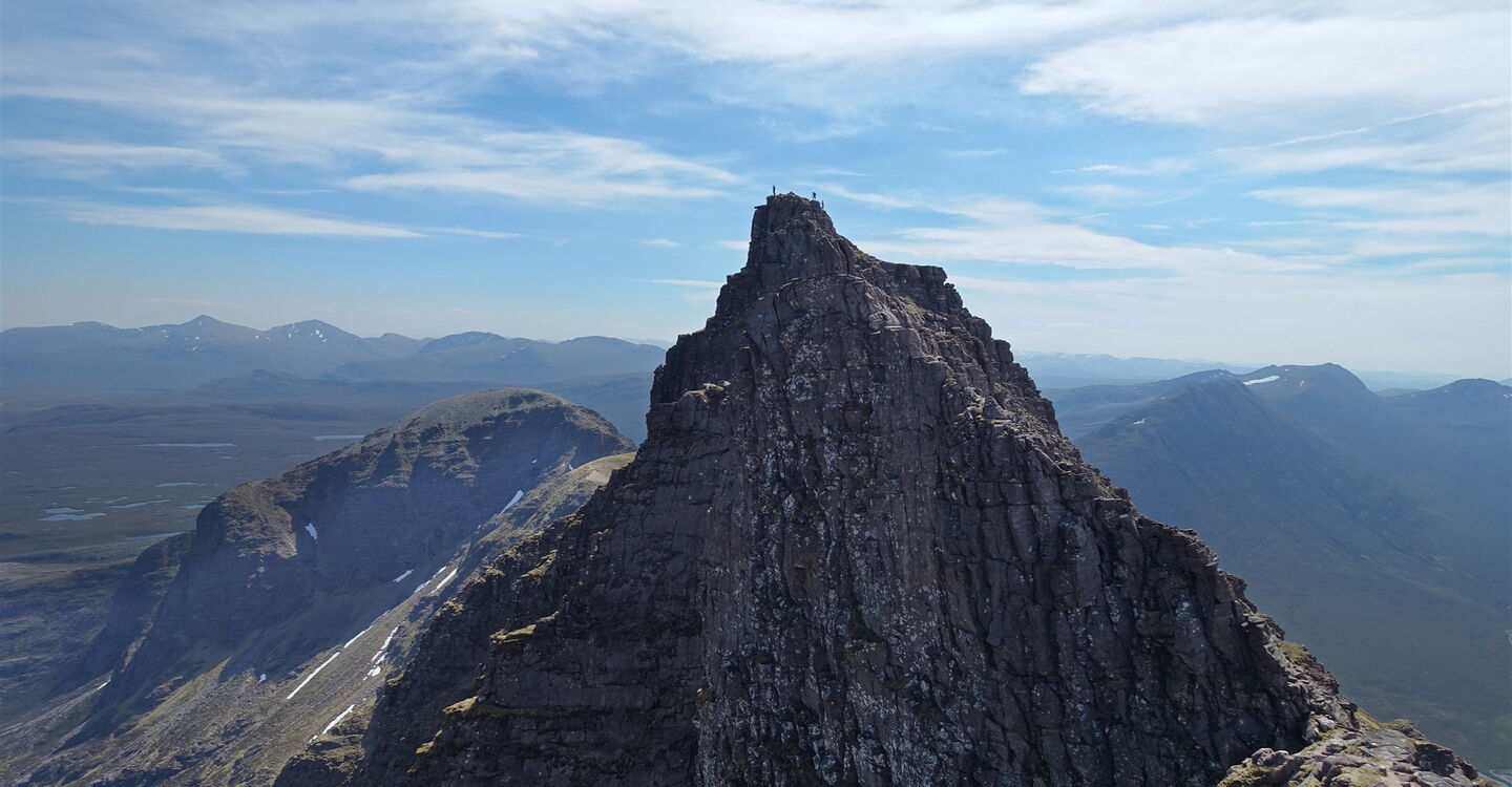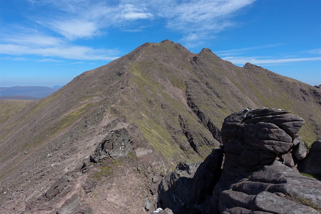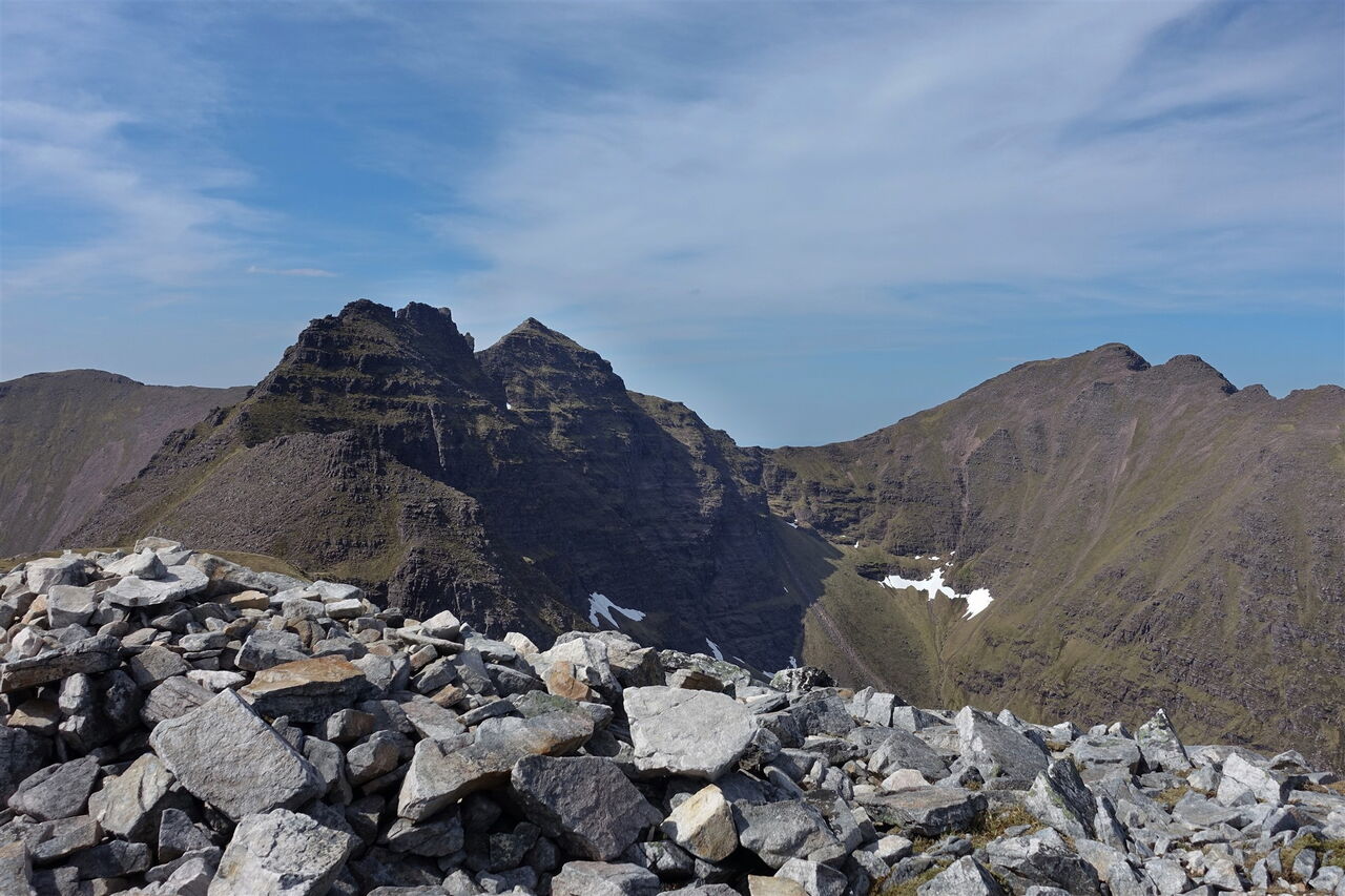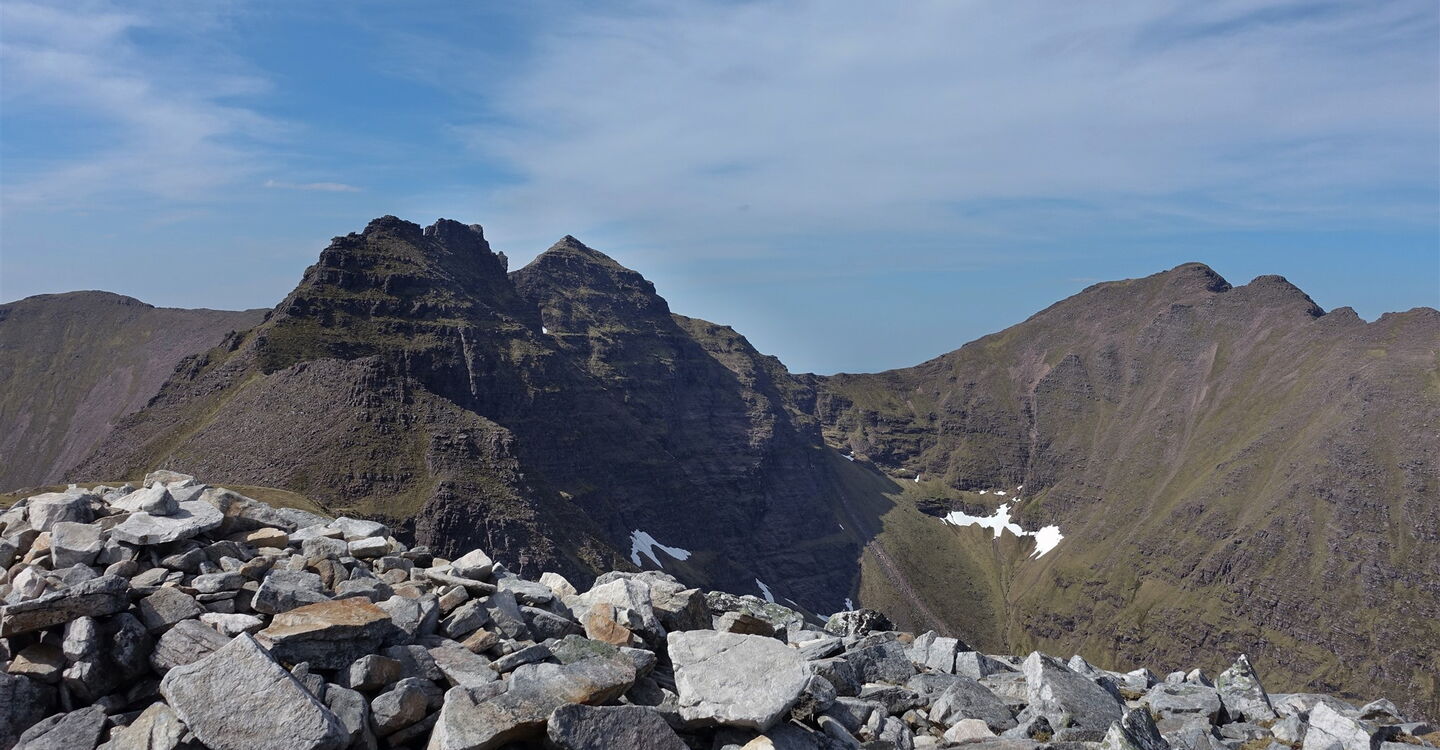 In einem Halbkreis gehen wir um den links von uns liegenden Hügel zur Einsattelung zwischen dem Glas Mheal Mor und dem Bidein a' Ghas Thuill mit seinen flachen Sandsteinplatten. Von dort steigen wir dann direkt auf dem felsigen Grat oder auf einem der vielen gerölligen Pfade, die sich durch den steilen Berghang ziehen, bis zum Gipfel des 02 Bidein a' Ghas Thuill (1062 m) auf. Dies ist der höchste der beiden Munros von An Teallach. Es ergibt sich eine 360°-Rundsicht, aber automatisch schaut man gebannt Richtung Südwesten, wo sich ein spektakuläres und einmaliges Panorama auf den Nachbargipfel Sgùrr Fiona und die kleinen Felsspitzen des Corrag Buidhe bietet – die wohl eindrucksvollste Aussicht in den schottischen Bergen.