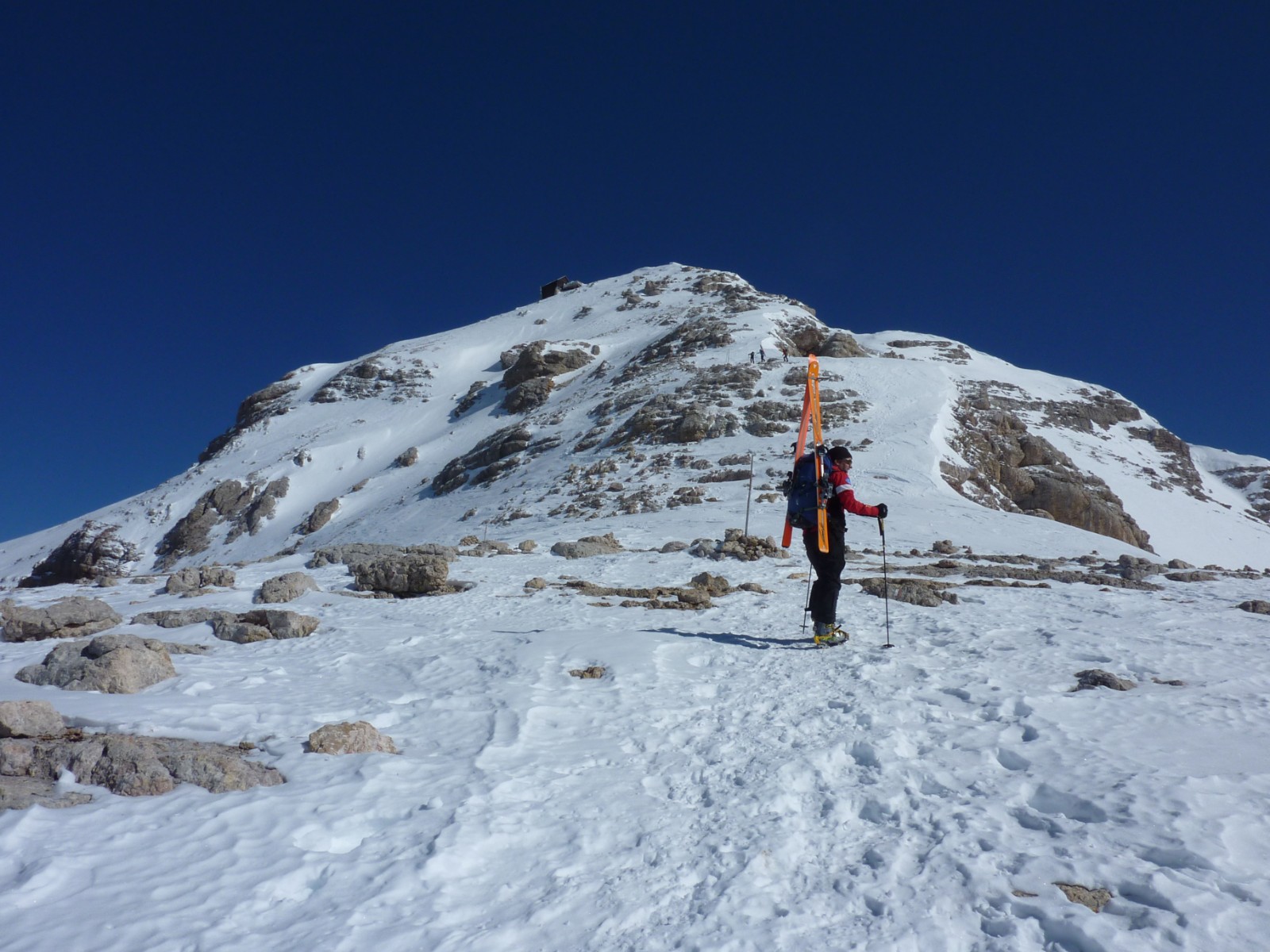 Einfache Orientierung, da der zu besteigende Piz Boè immer vor uns liegt. Bei der Abfahrt sind die Wegpunkte 4 und 5 zu beachten. Die Abfahrt führt über einen Südhang. Folgende Ausrüstung wird empfohlen: Produkte für alpine Sicherheit im Schnee, Tourenski, ggf. Steigeisen zum Aufstieg zum Piz Boè und Skitourenhelm. Es empfiehlt sich die Einkehr in das Rifugio Maria bei der Bergstation, welches nach Maria Piaz, der Pionierin des Tourismus am Pordoipass, benannt wurde. Beste Jahreszeit: Januar bis April. Uns erwarten kurze Stücke mit bis zu 45° Hangneigung.