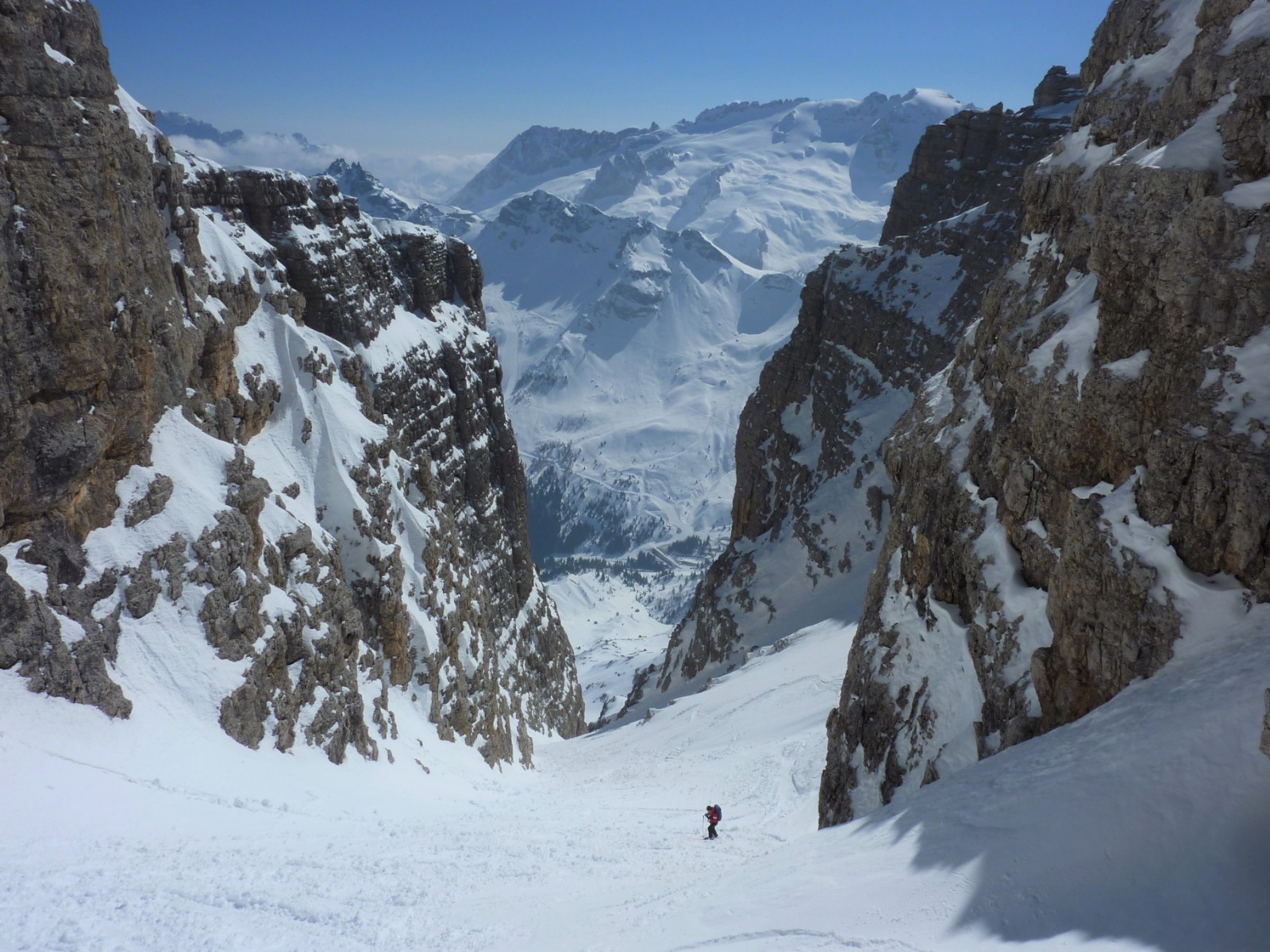 An der südöstlichen Flanke des Piz Boè fahren wir zum Einstieg ins nicht zu verfehlende Val de le Fontane, von wo man traumhafte Ausblicke auf die Marmolada und bis hinunter auf die Straße hat.