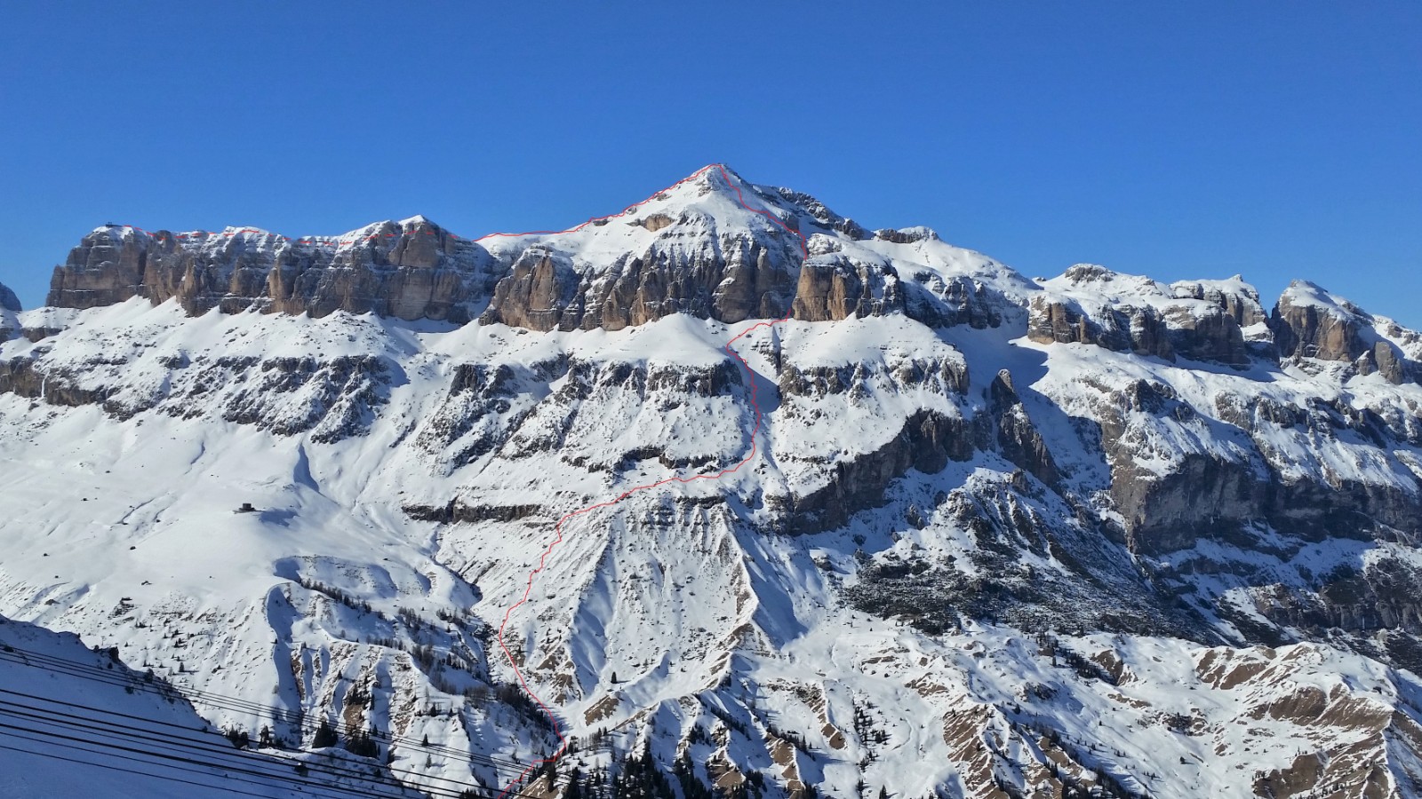 Nach der Pordoi-Seilbahn Nr. 120 fahren wir zum Rifugio Forcella Pordoi ab. Von hier geht es geradeaus weiter, dem Bandwurm zum Mittagstal folgend, bis wir dann abschnallen, um den Piz Boè zu besteigen.