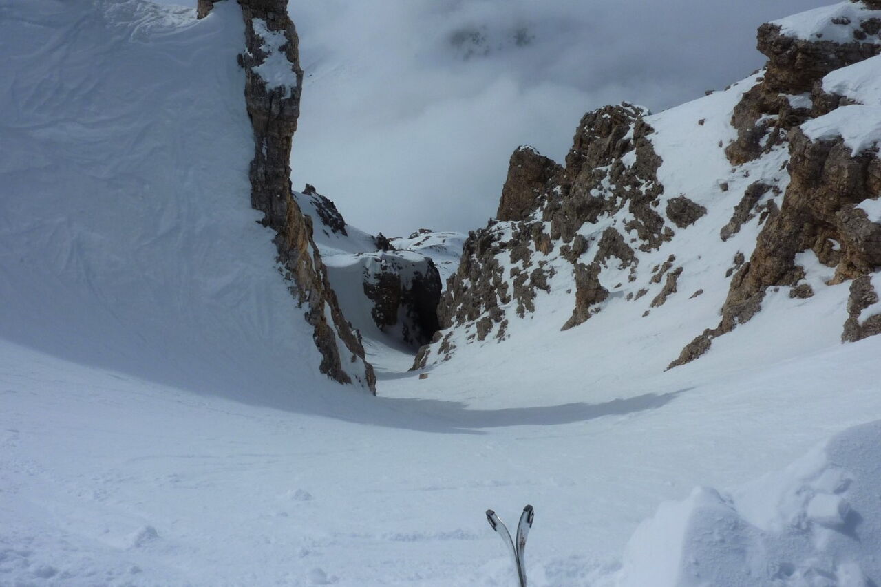 Am Ende der Canale Joel treffen wir auf die Ausläufer der Pordoischarte und fahren hier je nach Schneebedingungen in mehreren Varianten zur Talstation der Pordoi-Seilbahn Nr. 120.