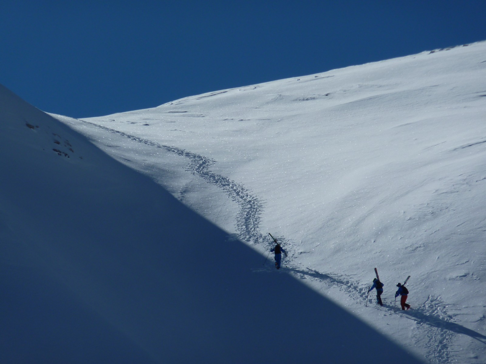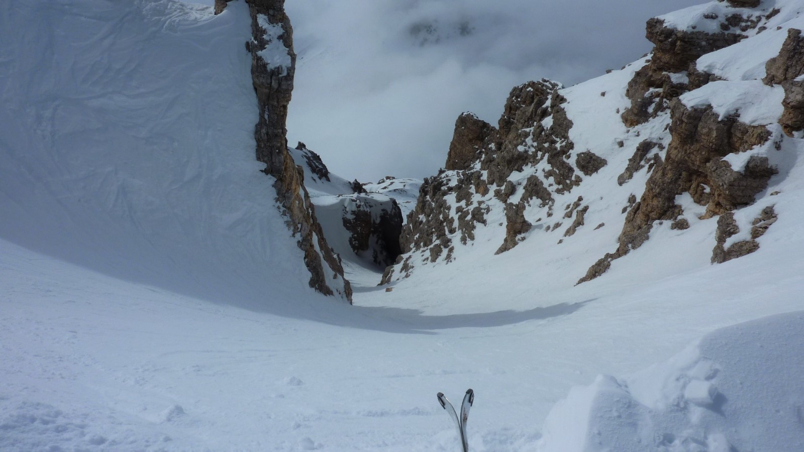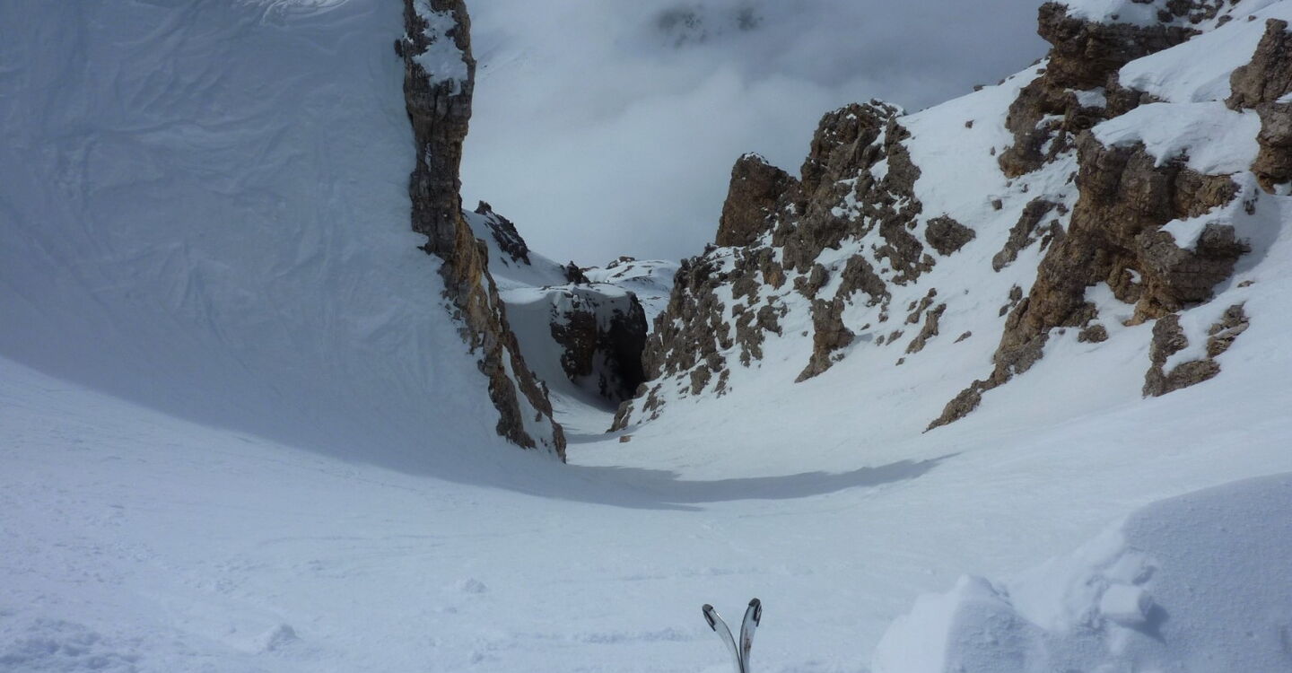 Zum Ende der Saison vereist der Südhang durch die Sonneneinstrahlung, und es gilt den richtigen Zeitpunkt für die Abfahrt zu finden, um die bis zu 45° steile Rinne zu befahren.