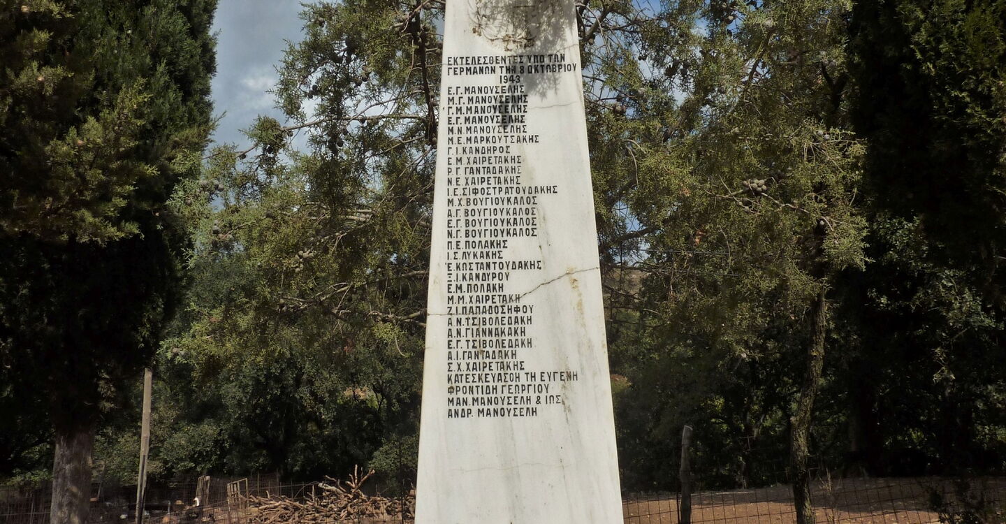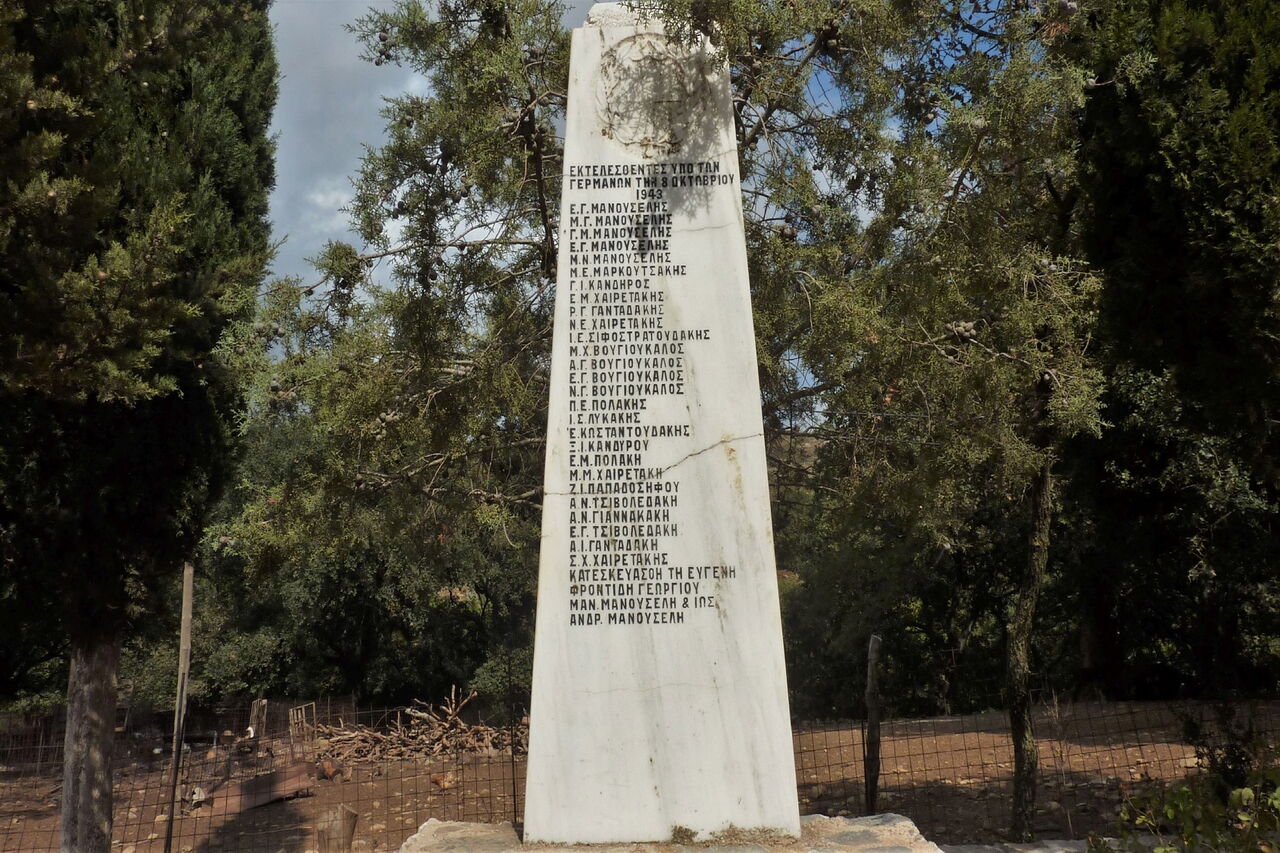 Wir sollten aber noch einmal 80 m rechts auf der Straße Richtung Kallikratis gehen, denn dort befindet sich ein Mahnmal. Während des Zweiten Weltkrieges haben die Nazis 29 Personen, 20 Männer und 9 Frauen, hingerichtet und damit das ganze Dorf vernichtet. Wir gehen die 80 m zurück und folgen der weiterführenden Straße 1 km über das Plateau bis zu den 05 Wild Herbs (721 m). Dabei kommen wir an einer Taverne vorbei, übrigens die einzige weit und breit.