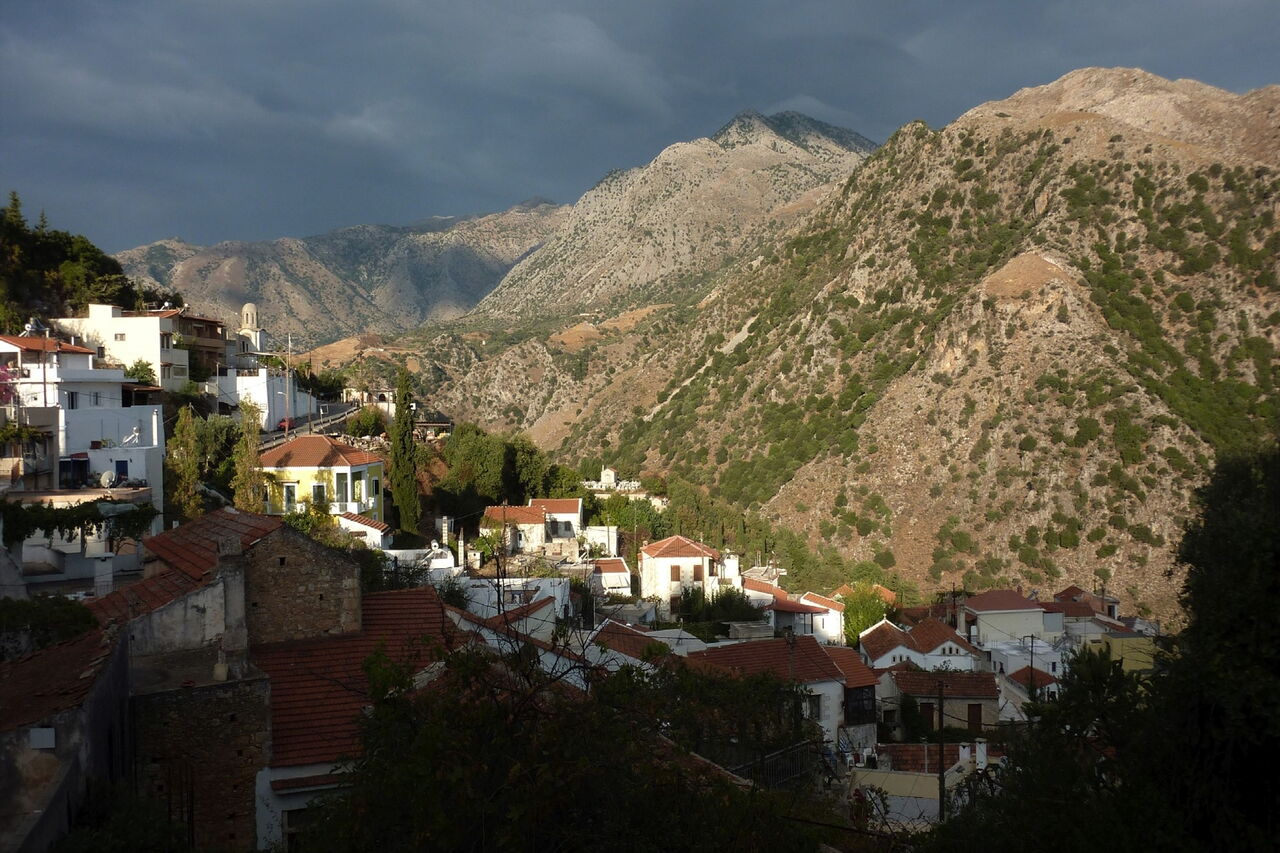 Am Hauptplatz von 01 Argiroupoli (600 m) mit der Kirche und dem Torbogen gehen wir die Asphaltstraße in das Unterdorf hinunter. Wir erreichen nach 120 m einen weiteren Platz, gehen links an dem Haus mit den braunen Fensterläden vorbei und in die Gasse hinunter. Bei der folgenden Weggabelung halten wir uns rechts und nach 60 m abermals rechts. Wir befinden uns nun auf einem steil bergab führenden Pfad zu den Quellen Agia Dynami des Mouselas-Flusses. An der Asphaltstraße angekommen, gehen wir links. Nach 500 m endet diese, wir gehen nun links auf der relativ unbefahrenen Straße durch eine enge Schlucht parallel zu einem Flussbett.