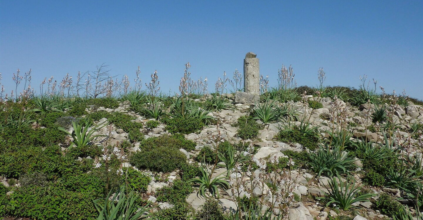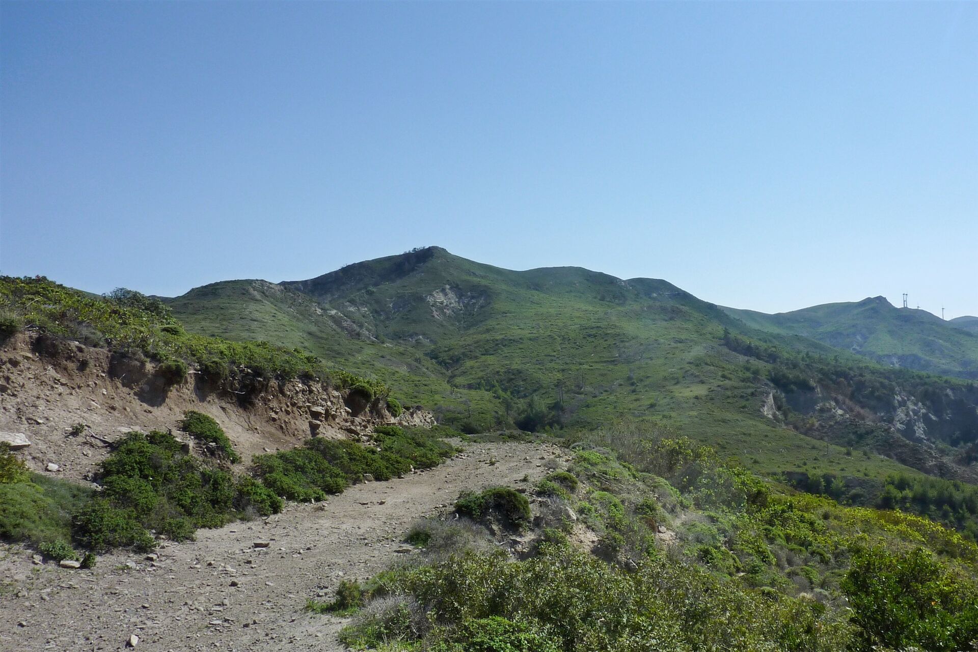 Wir passieren zwei Ziegenzäune und gehen nun in direkter Linie auf den zu besteigenden Berg und die dahinter liegenden Windräder zu. Wir erreichen die (02) Einsattelung (342 m) und können Richtung Westen und Osten das Meer ausmachen. Ein Steinmännchen markiert den Aufstieg auf dem Bergrücken in Richtung der Windräder. Auf einem gut ausgetretenen Ziegenpfad übersteigen wir schnell den ersten und den zweiten Hügel.