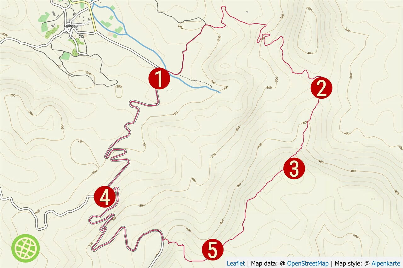 Vom (01) Start und Ziel (159 m) oberhalb von Arnitha gehen wir ein kurzes Stück auf der Schotterpiste zurück, biegen dann rechts bei der Weggabelung Richtung Quelle Vodi ab und überqueren das Trockenflussbett. Den folgenden rechten Abzweiger parallel entlang des Flussbetts lassen wir liegen. Nach einem guten Stück Aufstieg gabelt sich der Weg, vor uns liegt ein Olivenhain. Hier gehen wir auf dem rechten Arm weiter bergauf. Bei einem Zaun und einer Blechhütte gehen wir halb rechts und kurz später bei der Wegegabelung mit dem Steinhaufen erneut halb rechts.