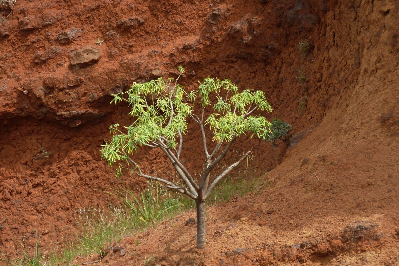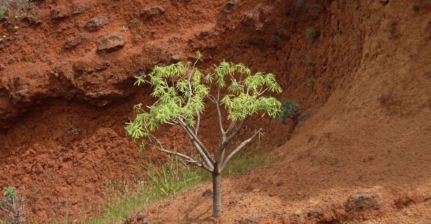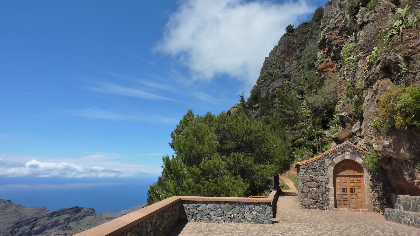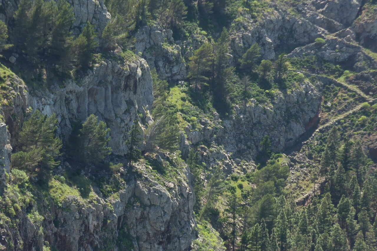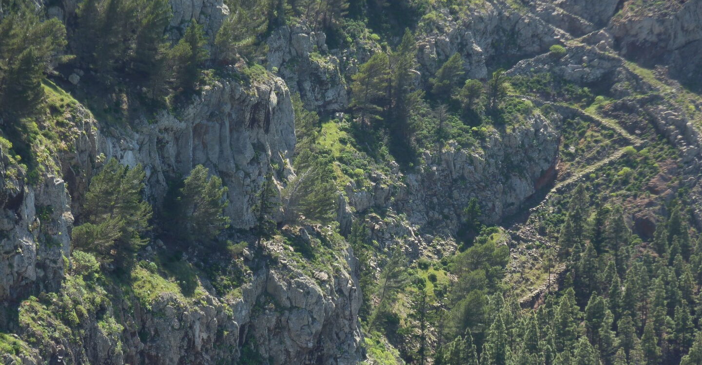 Vom (01) Start und Ziel in Arure (783 m) gehen wir unter dem großen Wasserviadukt hindurch und erreichen den ersten Höhepunkt des Tages, den Mirador del Santo. Er verdankt seinen Namen der nur einige Meter entfernt stehenden Kapelle, der Ermita del Santo. Von der Aussichtsplattform, die sich 800 m über dem Meeresspiegel befindet, genießt man einen überwältigenden Tiefblick in das Tal von Taguluche mit seinem imposanten Schluchtauslauf. Weiter rechts am Mirador befindet sich die Ermita del Santo. Sie liegt geschützt unterhalb einer mächtigen Felswand - dem Naturdenkmal Monumento Natural del Lomo del Carretón.