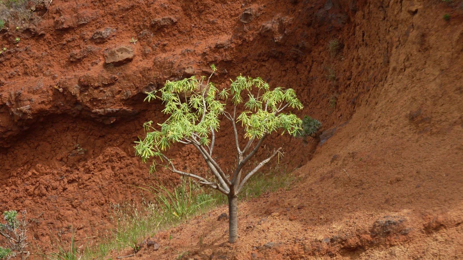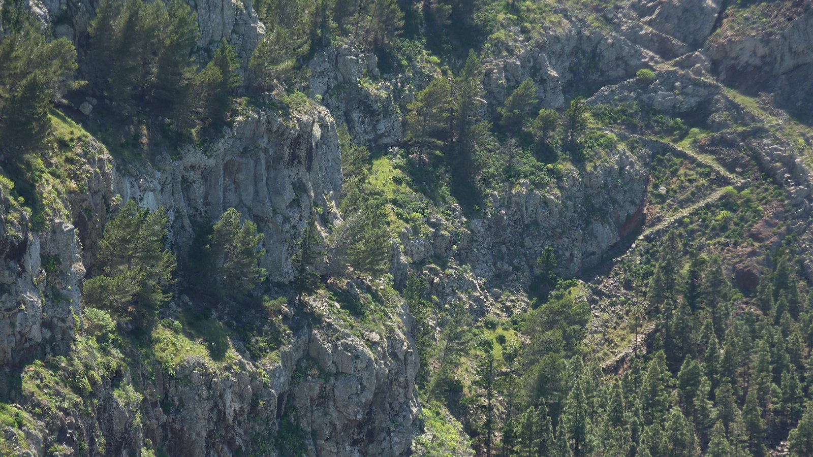 300 Höhenmeter über uns, eingefasst in die Felsen, sieht man den Mirador Santo. Der Pfad quert nun in südliche Richtung den Hang und es beginnt der (05) spektakulärste Abschnitt (616 m) der heutigen Wanderung. Wir laufen durch ein Gebiet mit kräftig grünen Kiefern und im Kontrast nicht real wirkendem roten Gestein und befinden uns auf einem mit Steinen angelegten Camino, der sich in engen Kehren nach oben schraubt. Bei einem Felsdurchbruch erreichen wir die Hochebene und gehen zunächst noch links unterhalb der Ziegenhaltung, um dann bei der folgenden Schotterpiste links bis zum Parkplatz vorzugehen.