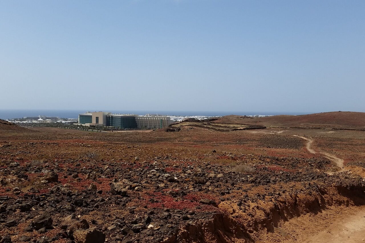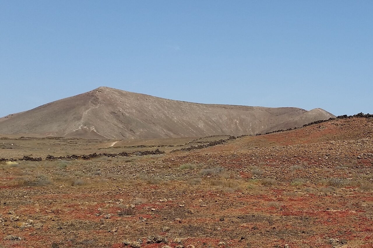 Nach 200 m, bei dem Abzweiger von der Hauptstraße nach rechts, überqueren wir die Straße nach links, passieren die hohe Mauer bei einem Durchlass und beginnen mit dem Aufstieg zum Gipfel der (03) Montaña Corona (225 m). Bei guter Sicht ergeben sich trotz der vergleichsweise geringen Höhe überraschende Fernblicke: So kann man entlang der Ostküste bis nach Arrecife blicken - gut zu erkennen am einzigen Hochhaus der Insel - und bei sehr guter Fernsicht kann man sogar die hell leuchtenden Dünen von Fuerteventura ausmachen. Richtung Norden erstreckt sich das Risco-de-Famara-Gebirgsmassiv (halb rechts), wir sehen die Burganlage von Santa Barbara oberhalb von TEGUISE und weiter links (Richtung Westen) lassen sich die Vulkane Montaña Tamia (550 m) und die Montaña Blanca (595 m) gut ausmachen.