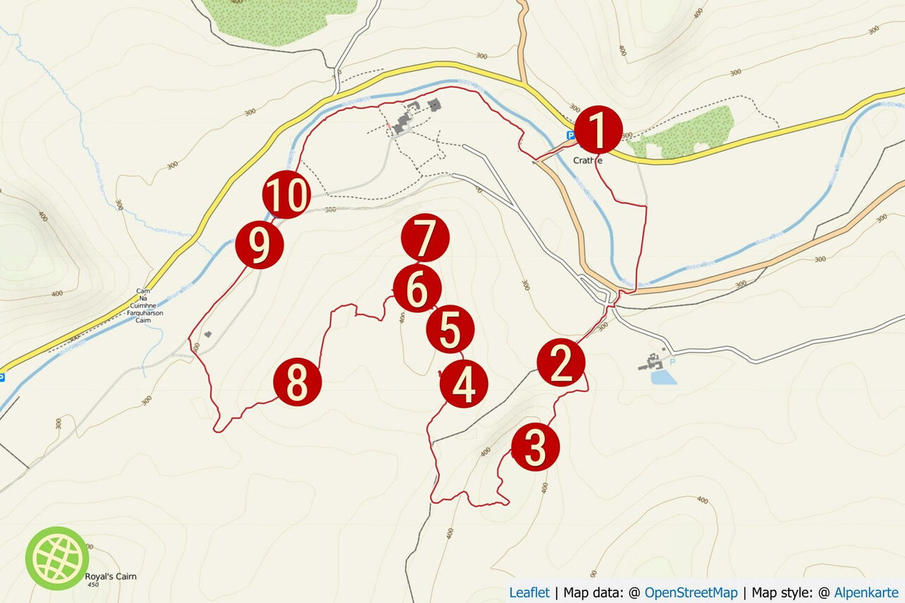 Mittelschwere Wanderung, die gutes Orientierungsvermögen erfordert, um die einzelnen Wegpunkte zu finden. Art des Weges: 10 % Straße, 30 % Piste und 70 % Pfad. Zusatzausrüstung: ein Navigationssystem mit dem heruntergeladenen GPS-Track zur unterstützenden Suche der Crains. Einkehr: Keine auf der Wanderung. Beste Wanderzeit: Ganzjährig. Sehenswert Region: Balmoral Castle, Entfernung 500 m, Geokoordinaten 57.040800 -3.230287. Hinweis: Dieser Spaziergang wird nicht empfohlen, wenn sich die königliche Familie im Schloss befindet; dies ist am wahrscheinlichsten zu Ostern, Weihnachten, im August und September. Zu jeder Zeit sollte die Privatsphäre der Bewohner des Schlosses und der umliegenden Gutshäuser respektiert werden.