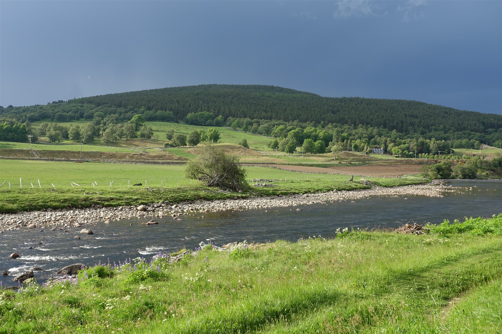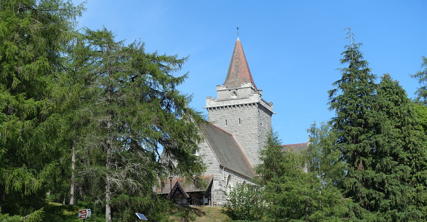 Wir gehen über den kostenpflichtigen Parkplatz in der kleinen Ortschaft Crathie Richtung Ballater. Auf Höhe des Souvenirladens befindet sich links oberhalb die 01 Crathie Kirk (274 m), wir gehen dort rechts auf der Asphaltstraße herunter. Im weiteren Verlauf ignorieren wir den rechten Abzweiger zum Friedhof und gehen bis zum Ende der Straße. Dort gehen wir dann rechts, halten uns hinter der Suspension Bridge über den Fluss Dee rechts, biegen nach weiteren 80 m links ab und nehmen dann die zweite Straße links – die erste führt zur Royal Lochnagar Distillery. Unser Weg führt an malerisch gelegenen Cottages vorbei.