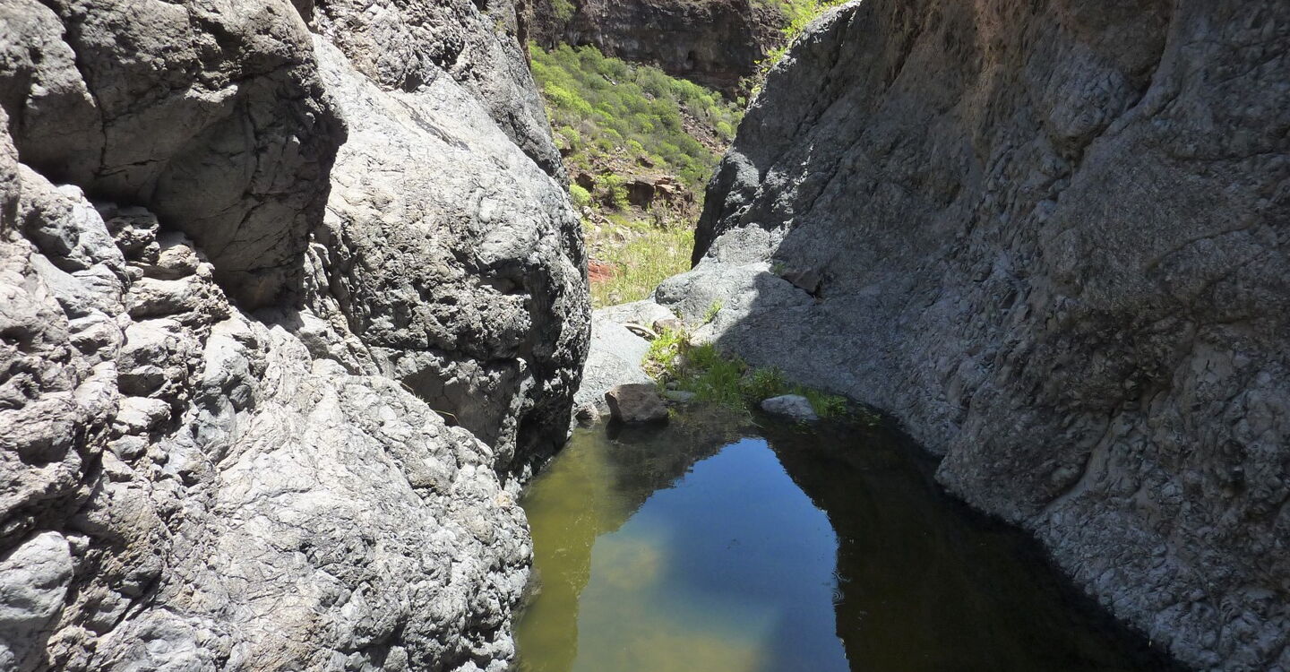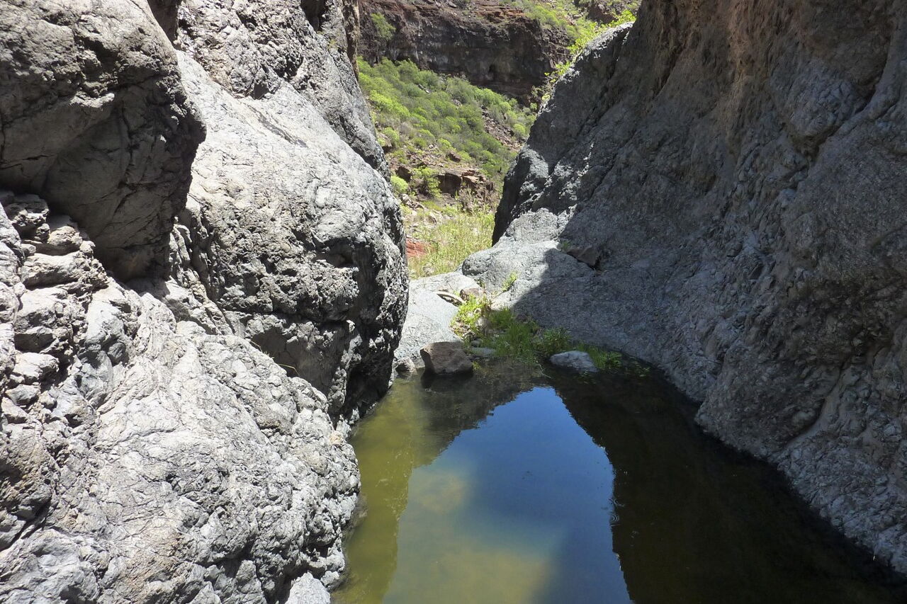 Es folgt ein relativ entspanntes Stück, bis wir die nächste (04) Schlüsselstelle bei einem Wasserfall (359 m) erreichen. Abermals mündet der Flusslauf in einen unüberwindbaren Wasserfall, den wir umlaufen müssen. Auf der rechten Seite des Barrancos steht ein kleiner Kiefernwald. Nach nur 10 m Anstieg erreichen wir links im Felsen eine kleine Rinne, in der wir auf den 15 m hohen Bergrücken aufsteigen - Schwierigkeitsgrad drei und Absturzgefahr! Auf der Rückseite des Bergrückens angekommen, bahnen wir uns den Weg zurück ins Barranco. Diesem folgen wir nun talauswärts, bis von links eine Straße in das Barranco führt.