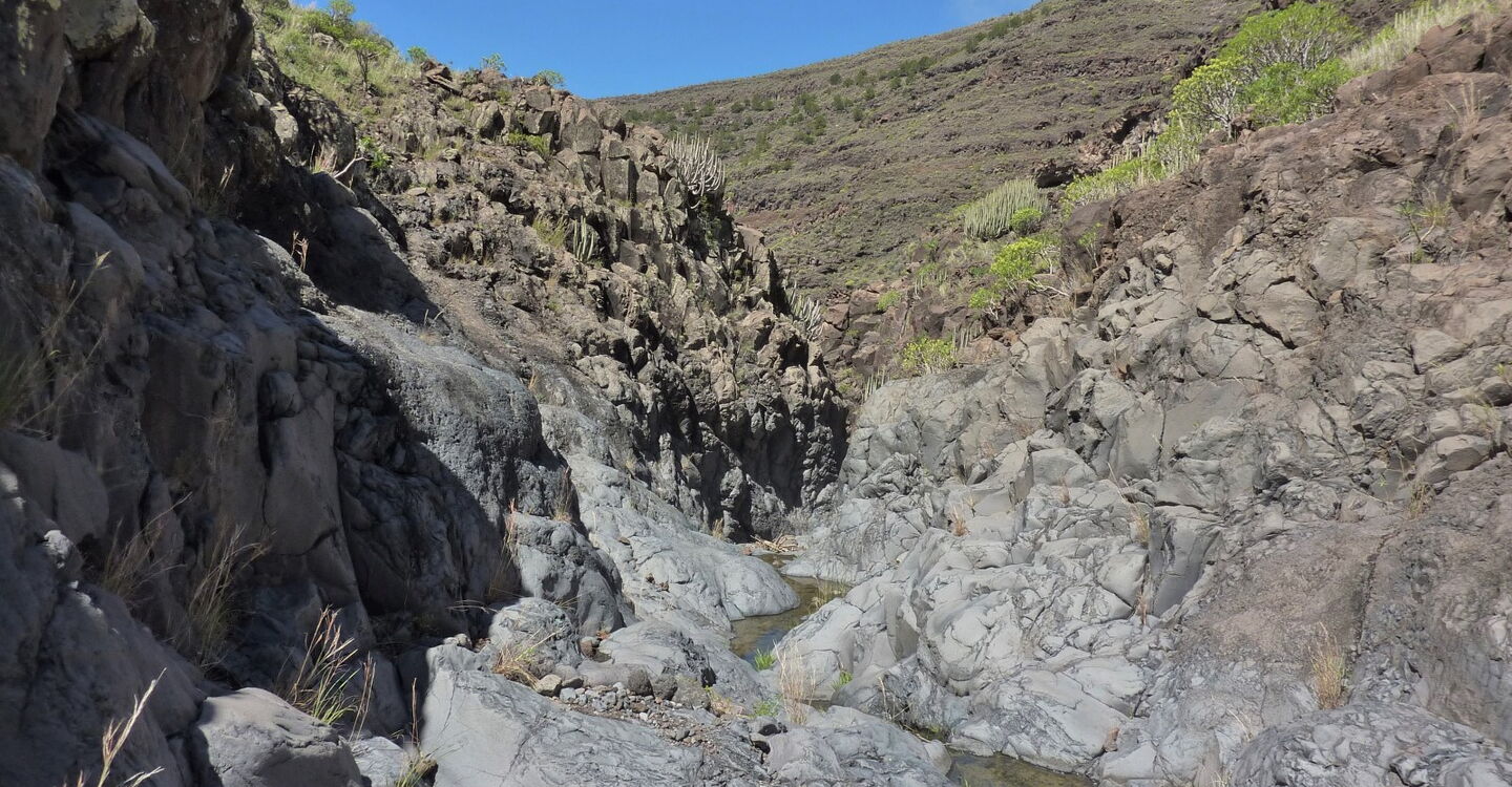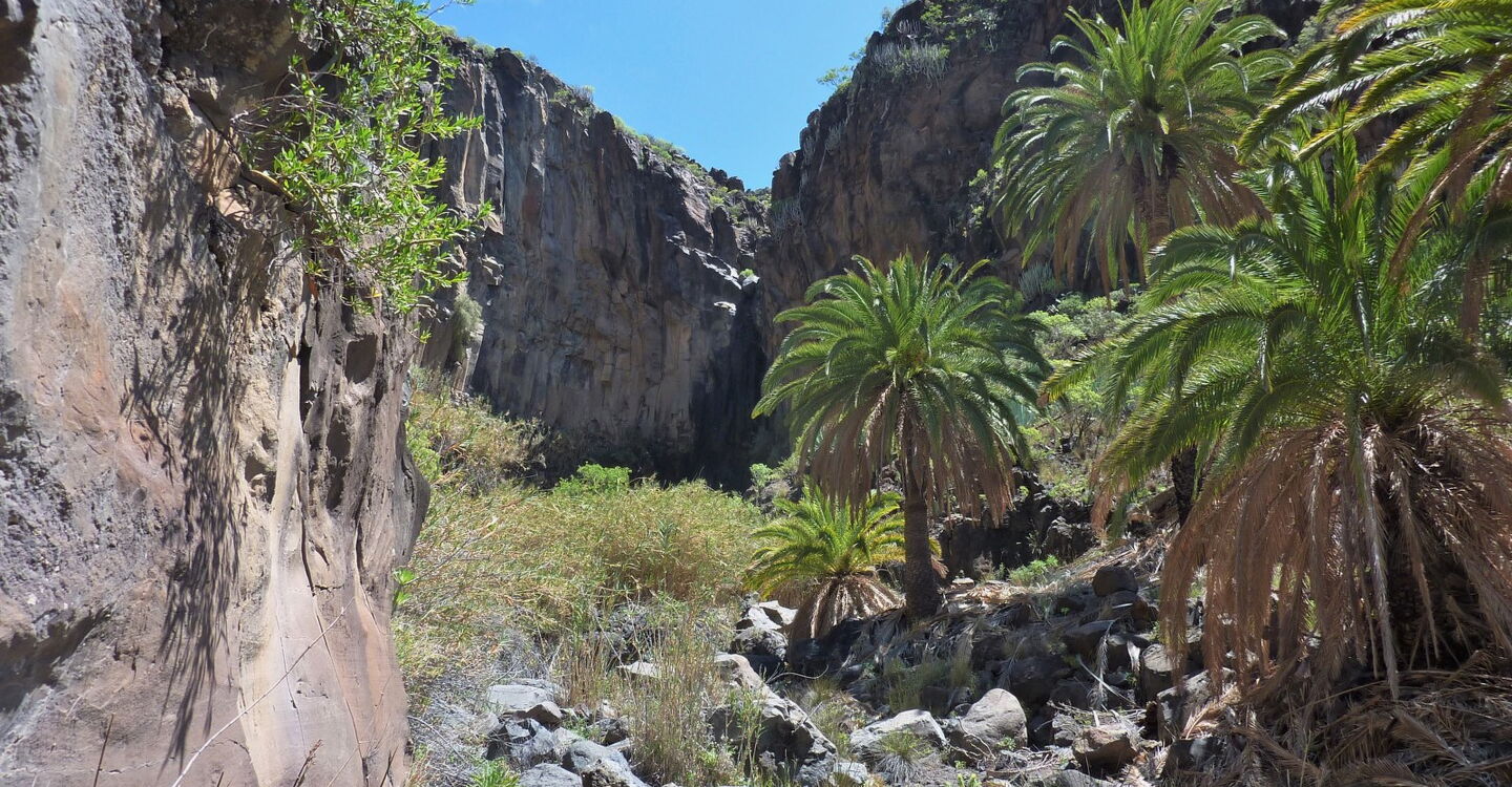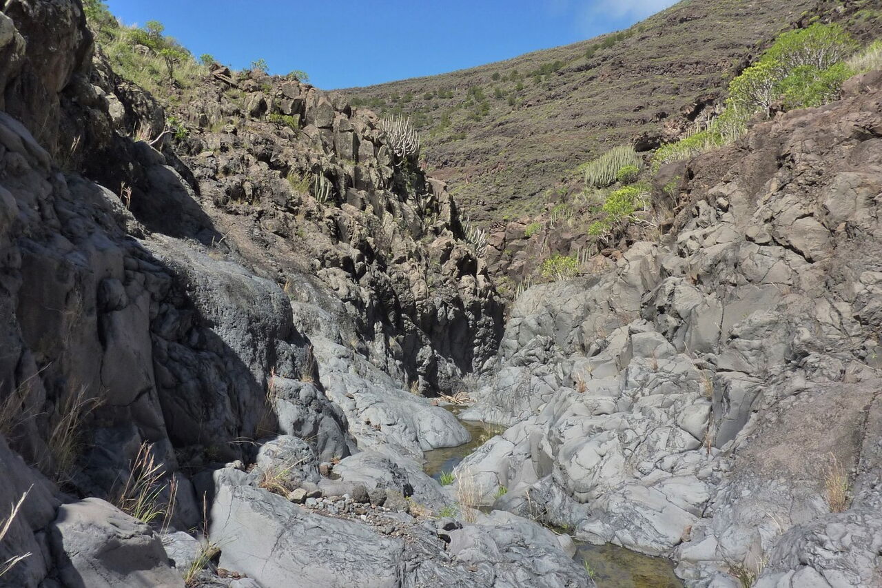 So weit wie möglich rechts im Trockenflussbett laufend, erreichen wir den (05) Playa de Iguala (5 m). In Kehren, die auf den westlich vom Barranco liegenden Höhenzug führen, steigen wir auf und folgen im weiteren Verlauf dem Fernwanderweg GR 131 und der Ausschilderung zum Valle Gran Ray. Nach 620 Höhenmetern haben wir den Parkplatz erreicht.