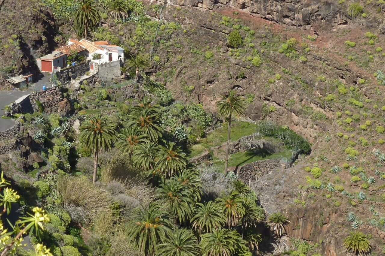 Am (01) Start und Ziel (612 m) übersteigen wir die Metallkette und gehen bergab - vorbei an einigen Häusern -, bis wir nach einer langen Kehre das letzte Haus vor dem Barranco erreichen. Noch vor dem Haus (etwa 20 m) führt rechts ein Pfad auf die Terrassenfelder am Barranco herunter. Wir gehen an dem rechts von uns liegenden Zaun entlang, bis wir in das Barranco einsteigen. Durch dieses gehen wir rechts weiter, bis der Zaun endet und wir oberhalb eines Wasserfalls stehen. Hier beginnt links bergauf ein selten begangener Pfad. Im weiteren Verlauf passieren wir eine rechts von uns stehende Palme und sehen eine Ruine, die sich 60 m oberhalb des Weges befindet. Kurzfristig ist der Pfad schwer auszumachen, bis wir auf einen gut zu erkennenden Pfad stoßen, welcher nun halb links - in östliche Richtung - bergab führt.