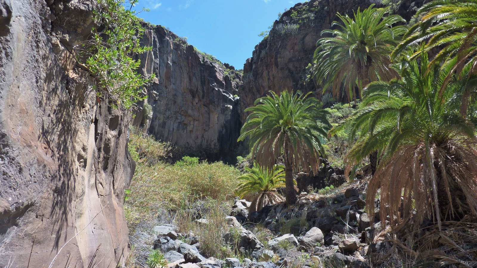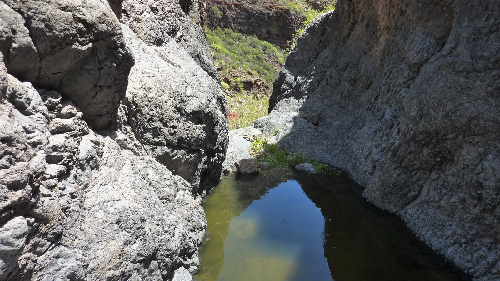 In diesem unwegsamen, weglosen und steilen Gelände steigen wir nun zur (03) Schlüsselstelle bei den Palmen (362 m) ab. Auch an dieser Stelle müssen wir einen unüberwindbaren Wasserfall umgehen. Dazu queren wir das Barranco und gehen - ohne dabei an Höhe zu verlieren - auf der rechten Flussseite talauswärts, bis der Weg eine 90°-Wendung nach rechts macht. An dieser Stelle können wir uns einen Abstiegsweg direkt in das Barranco bahnen. Aber auch nach diesem Abstieg wird uns keine Atempause gegönnt, denn nur einige Meter weiter mündet das Barranco in eine tiefer liegende Gumpe. Bei wenig Wasserstand kann man in diesem trockenen Flussbett einige Meter absteigen, um dann links über rotes Gestein die Gumpe zu umgehen.