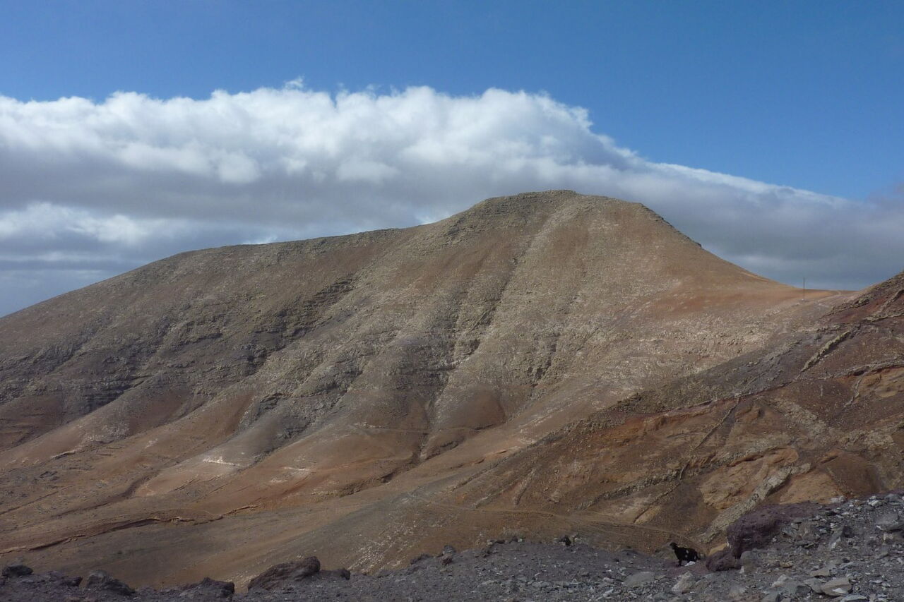 Danach geht es in Kehren 2 km und 200 Höhenmeter bergauf bis zur Einsattelung (05) Degollada de Portugués (431 m). Links, etwas unterhalb unseres Standorts, liegt eine weitere Ziegenhaltung. Von dort führt eine Schotterstraße zur LZ-702, in die El-Ruicón-Ebene. Rechts von uns befindet sich ein Abzweiger auf den Pico Redondo. Wir gehen aber auf dem eingeschlagenen Weg weiter - dabei macht der Weg eine leichte Rechtskurve um eine Kuppe herum -, bis wir nach 100 m auf einen Pfad treffen. An dieser Stelle wandern wir weiter rechts und gehen nun Richtung Norden durch die Westflanke des Pico Redondo. An den Stellen, wo der Weg angelegt wurde, schimmert hellbraunes Gestein hindurch. Als Orientierungshilfe können wir eine Wasserleitung nutzen, die auf dem ersten Teilstück parallel zum Weg verläuft. Im Verlauf gehen wir unter zwei Strommasten hindurch und erreichen bald die Ziegenhaltung, die wir bereits vom Hinweg kennen. Von hier aus gehen wir das letzte Teilstück bis nach Femès herunter.