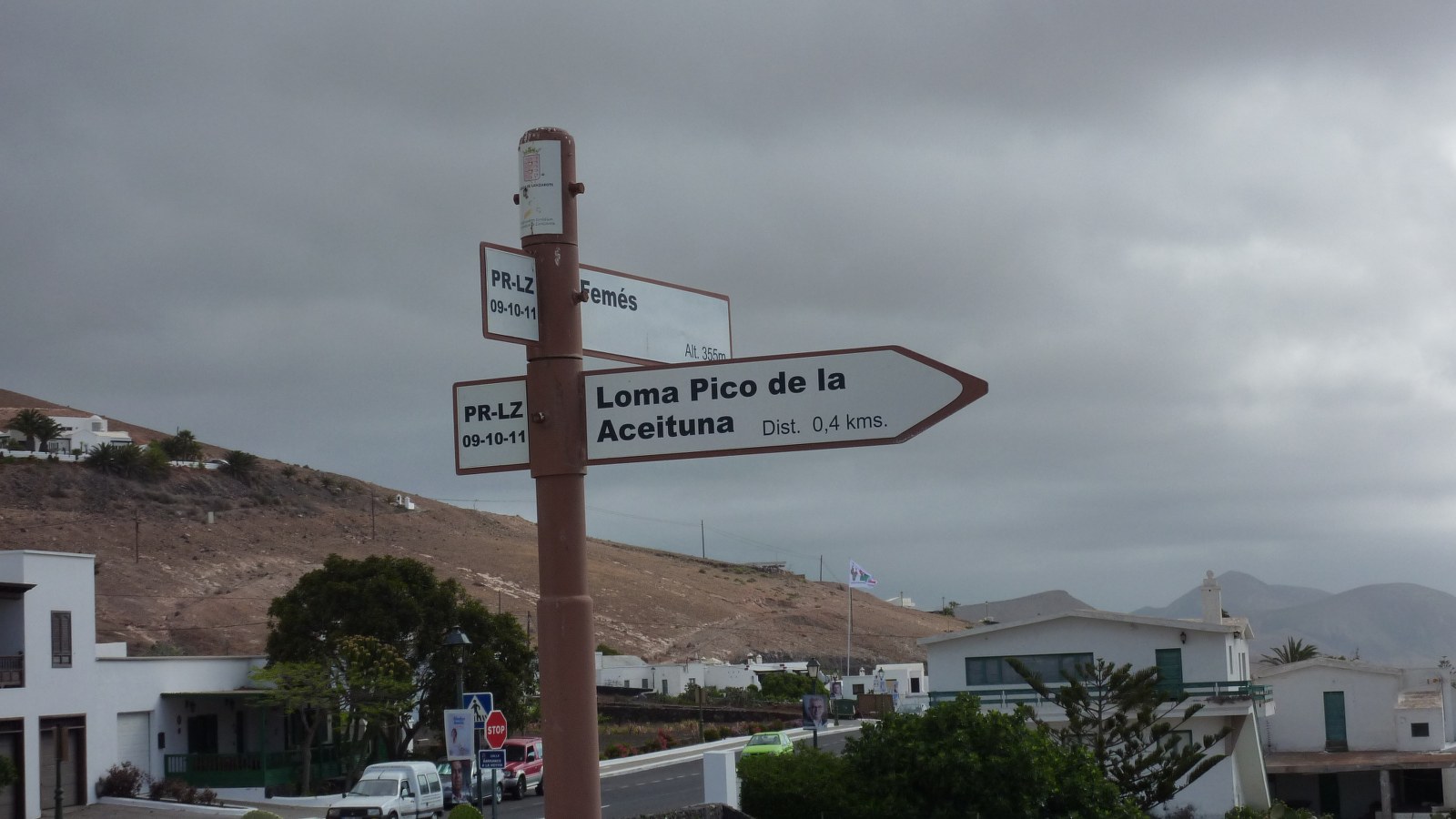 Von der Bushaltestelle (01) in Fémes (355 m) gehen wir Richtung Playa Blanca, also bis zum Kreisverkehr, vor. Rechts von uns befinden sich ein Parkplatz und die Kirche. An der nun gegenüberliegenden Ausfahrt im Kreisverkehr, bei dem Wegweiser Richtung Loma Pico de la Aceituna, führt eine Schotterstraße in kleinen Kehren zu dem braun-gelben Gebäude einer Ziegenhaltung hinauf.