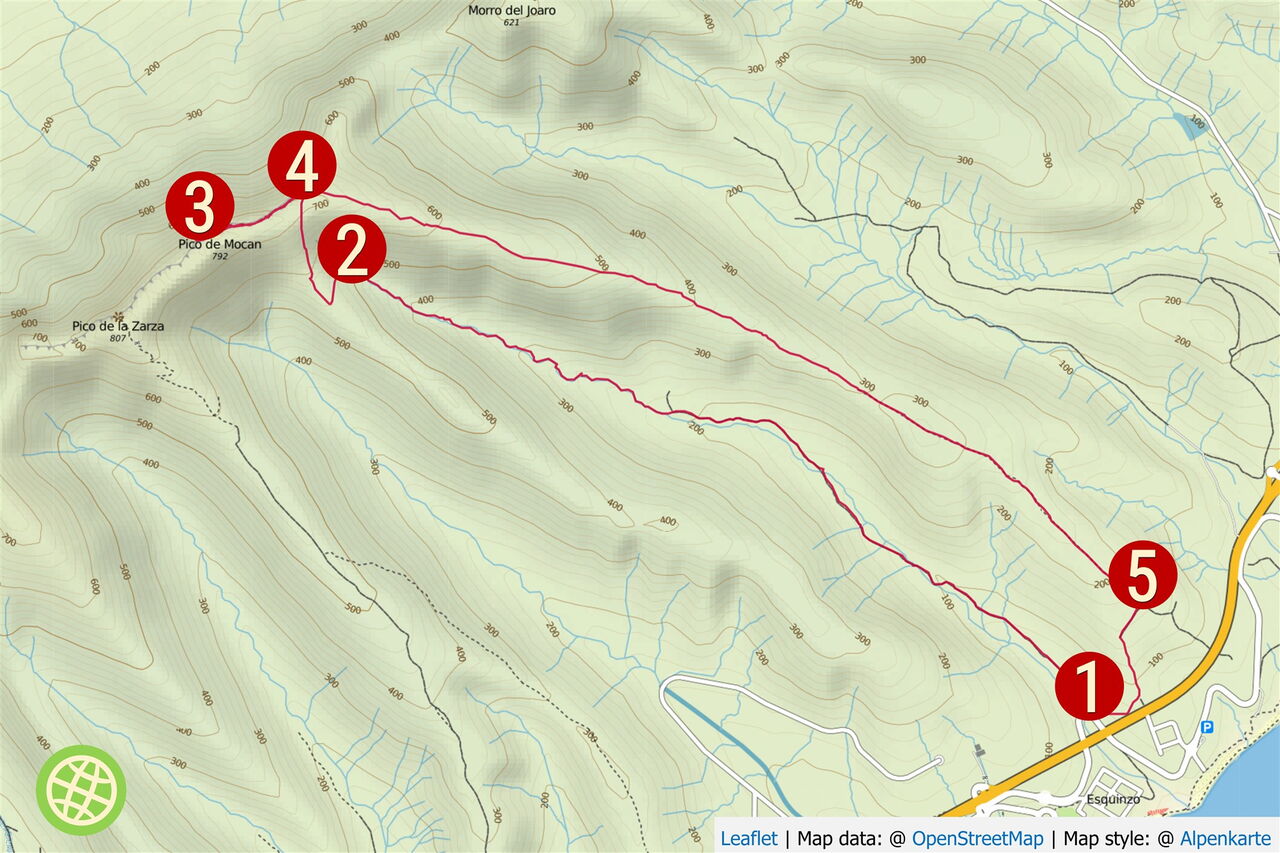 Nach 3 km treffen wir auf Steinmännchen und einen Pfad. Im Anschluss an einen weiteren Aufstieg erreichen wir die Überreste einer Schotterpiste. Wir können bereits unterhalb die Häuser von Esquinzo sehen und lassen den ersten Abzweiger nach rechts liegen. Sobald wir uns auf Höhe einer Stromleitung befinden, biegen wir rechts ab und gehen auf einen Strommasten zu, um dort links in Richtung (05) Autobahn (168 m) herunterzulaufen. Kurz vor dieser gehen wir rechts – parallel zur Autobahn – und erreichen den Pkw-Parkplatz.