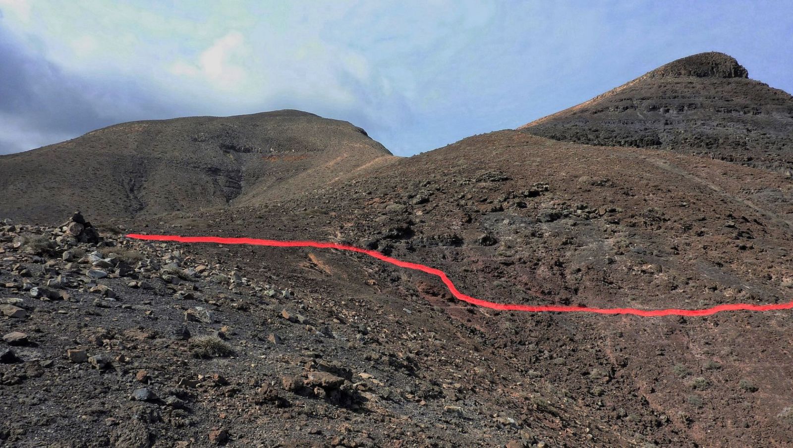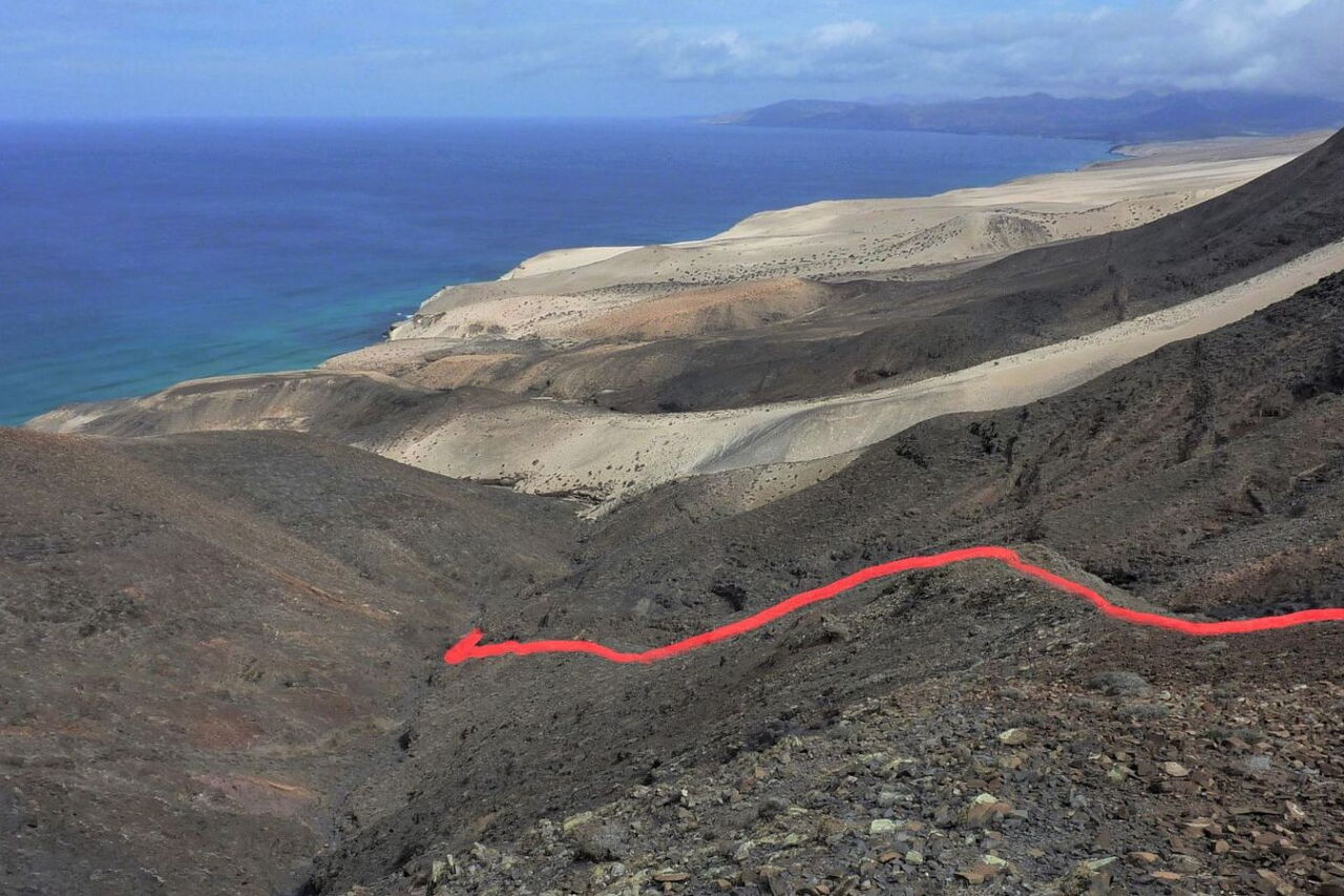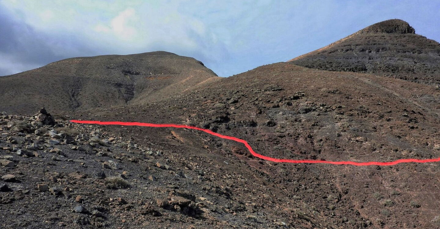 Nach nur 100 m Aufstieg auf einem schmalen Pfad gehen wir rechts auf dem vor uns liegenden (04) Bergrücken (190 m) mittig bergab. Nach weiteren 300 m steigen wir an einer günstigen Stelle in das Barranco hinab und folgen der Falllinie. Am Ende des Barrancos treffen wir auf einen Küstenpfad, dem wir links 400 m folgen.