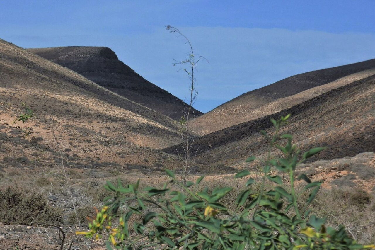 Busanbindung: keine. Mit dem Pkw fährt man 9 km von der Costa Calma auf der FV-2. Genau 1 km nach der Abzweigung links Richtung Risco del Paso – wir haben das breite Barranco Pecenescal gequert – biegen wir rechts ab und anschließend sofort wieder rechts auf die beginnende Schotterstraße. Dieser folgen wir nun 1,5 km, bis wir auf der linken Seite eine Ziegenhaltung sehen. Der Weg gabelt sich nun in drei Richtungen. Man kann hier auf der linken Seite im Gelände das Auto gut parken. Geokoordinaten Parkplatz: 28.126355 -14.286512.