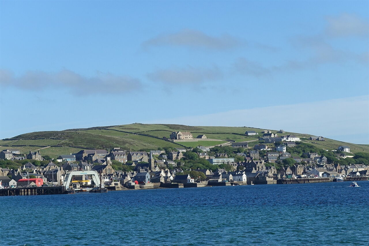 Die Schotterpiste weicht einer Asphaltstraße. Abzweiger nach rechts und links werden ignoriert. Wir folgen dem Straßenverlauf durch die Rechtskehre und die Linkskehre und gehen geradeaus durch den ersten Kreisverkehr, sodass wir nun 05 Stromness (30 m) erreicht haben. Nach 50 m folgen wir nicht der Hauptstraße durch die Rechtskehre, sondern gehen hier geradeaus. Nach abermals 50 m, bei den großen weißen Säulen, biegen wir links in die Franklin Road ab. Diese verlassen wir auf einem halb rechts abzweigenden Fußgängerweg, der kurz später endet. Wir gehen nur noch einige Meter rechts herunter und erreichen den Dorfkern von Stromness. Durch die alten Gassen gehen wir links zurück bis zum Busbahnhof oder Parkplatz.