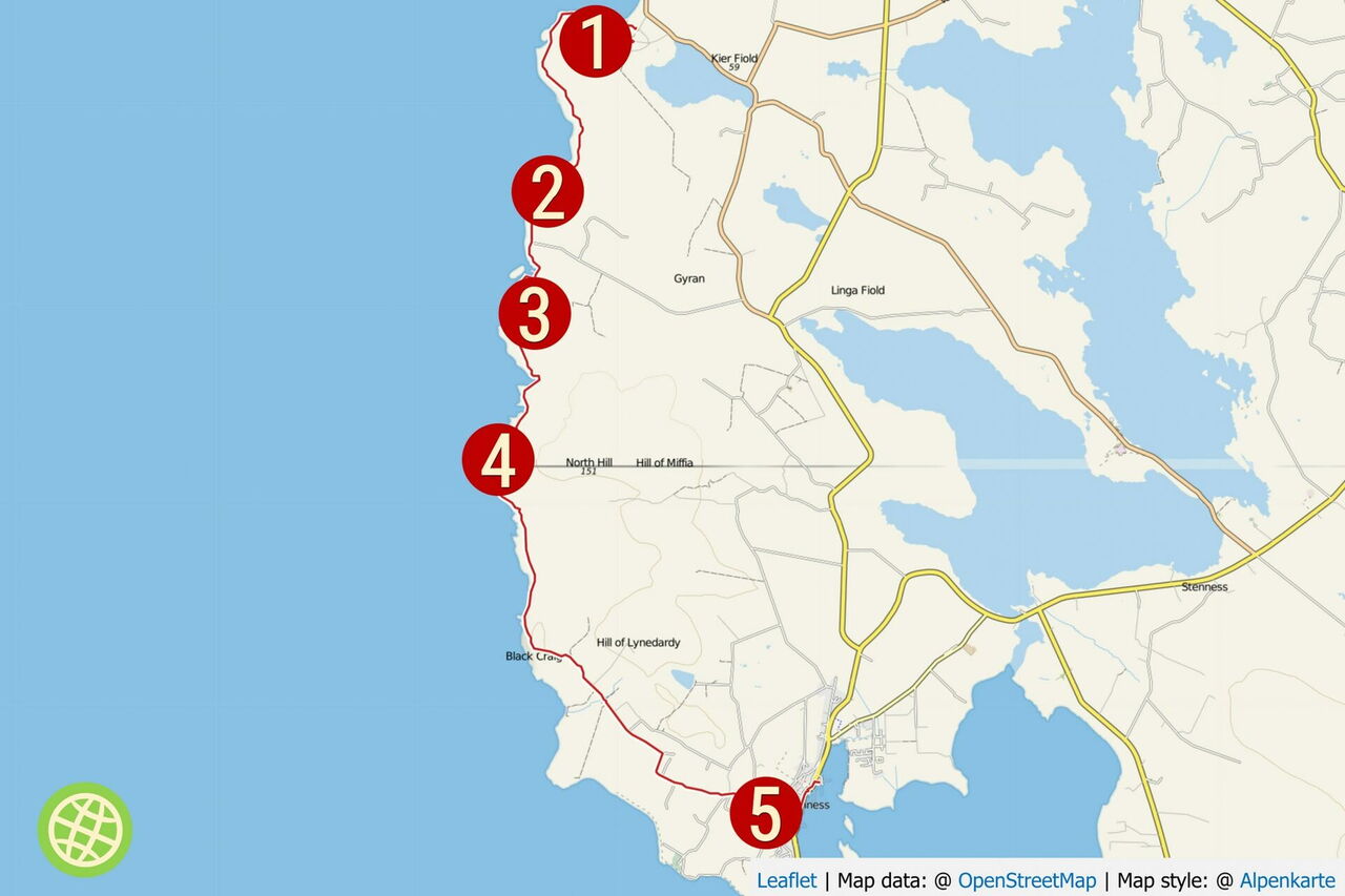 Pkw-Anfahrt: Der Start in Stromness befindet sich 24 km westlich der Hauptinsel Mainland auf den Orkney-Inseln. Im Hafengelände gibt es kostenlose Parkplätze. Geokoordinaten: 58.964105 -3.295722. Busanbindung nach Stromness: alle wichtigen Buslinien, Bushaltestelle Stromness, At Travel Centre On Ferry Road; Linie 8S Richtung Kirkwall und Birsay, Abfahrt 10:32 – das ist die einzige Verbindung ohne lange Umsteigezeiten! – nach Skara Brae, At Visitor Centre On Car Park (Anfang der Wanderung), Fahrzeit 17 min. GPS-Pkw: 59.048667 -3.335141. Bitte informieren Sie sich über die jeweils aktuellen Busverbindungen auf der nachfolgenden Webseite: https://www.travelinescotland.com.