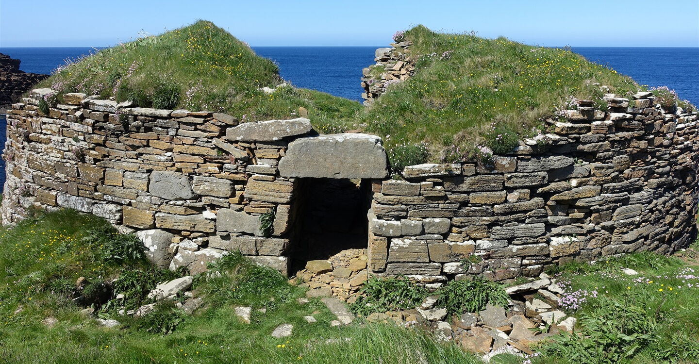 Direkt hinter dem Steinhaus bei den Ausgrabungen gehen wir durch die Pforte und anschließend durch die Dünen auf dem Pfad parallel zum Meer. Nach einem kurzen weglosen Abschnitt erreichen wir einen Steinhaufen und können von dort den weiteren Verlauf der Strecke sehen. Bei besonders guter Sicht kann man die Nachbarinsel Hoy sehen, rechts davon ragt der Old Man of Hoy aus dem Wasser. Nach ungefähr 1,4 km erreichen wir die längste Geo auf den Orkney-Inseln, die 300 m lange und 50 m über dem Meeresspiegel liegende Ramna Geo. Und schon folgt hinter einer Holzbrücke die nächste Sehenswürdigkeit, der 02 Broch of Borwick (18 m). Brochs sind Trockensteinkonstruktionen aus exakt aufeinandergeschichteten Steinen, ohne die Verwendung von Mörtel. Er wurde ca. 1000 Jahre bewohnt, bis er dann aufgegeben wurde, vielleicht als die Reiche der Pikten und der keltischen Skoten 843 n. Chr. unter Kenneth MacAlpin vereinigt wurden.