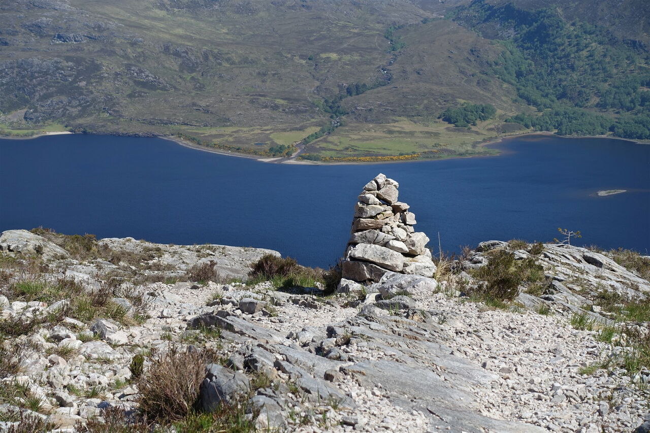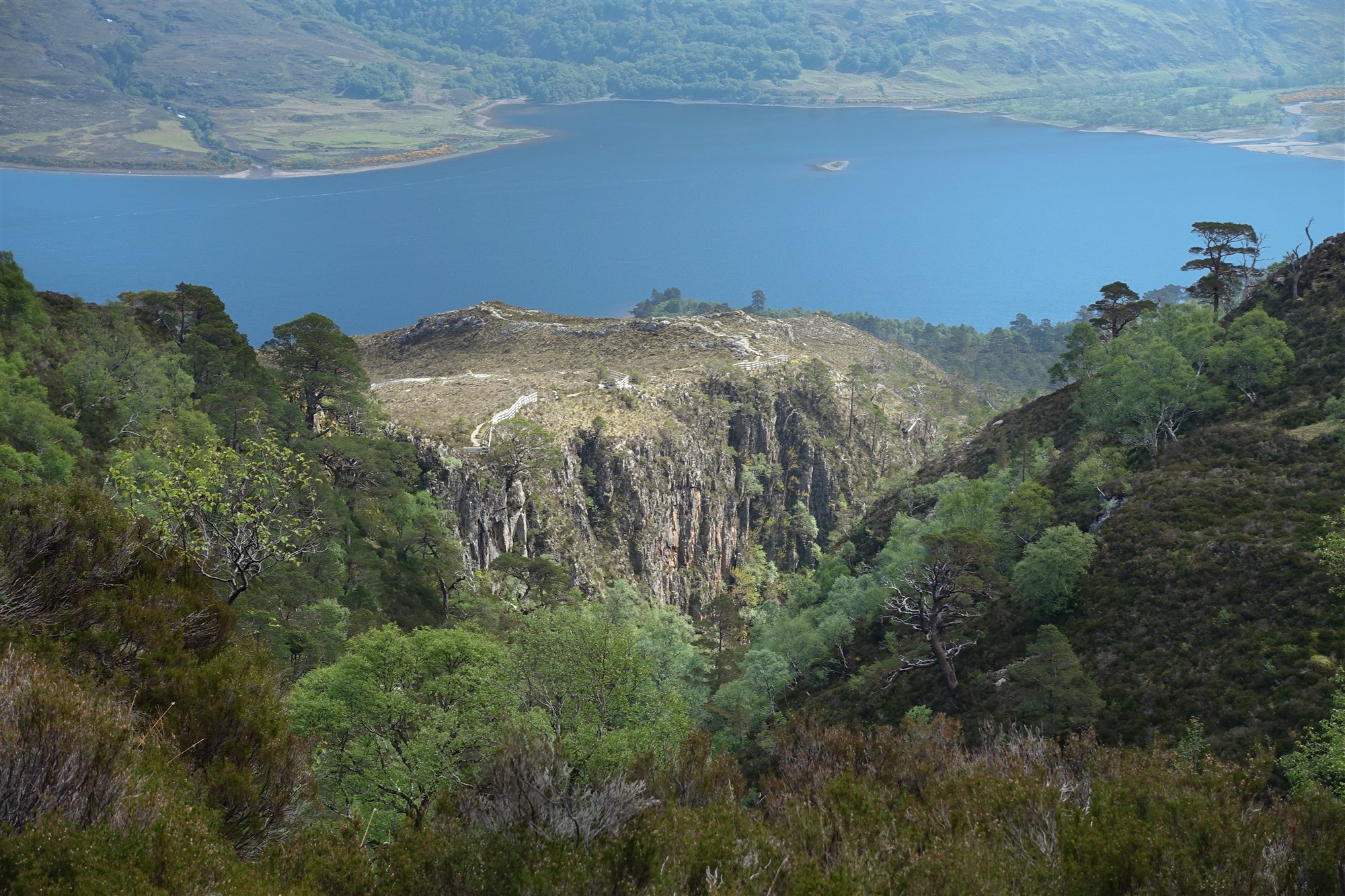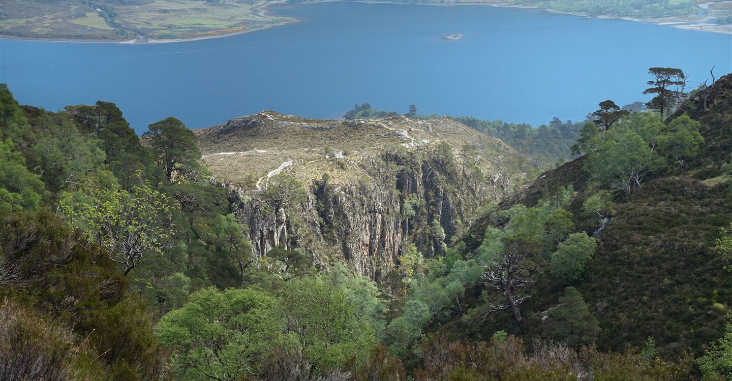 Bänke am Wegesrand laden zum Verweilen ein, um die prachtvolle Landschaft und den Loch Maree zu bestaunen – ein Süßwassersee und mit einer Fläche von 28 km² der flächenmäßig viertgrößte See Schottlands. Einen weiteren rechten Abzweiger ignorieren wir, es sei denn, wir wollen nur eine kleine Runde gehen; in diesem Fall gelangen wir über den sogenannten Woodland Trail wieder zurück zum Ausgangspunkt. Auf einem perfekt angelegten Pfad – an wenigen Stellen sind sogar Stufen in den Fels geschlagen – gelangen wir an eine Holzabsperrung, dahinter blickt man tief in den 02 Canyon Allt na h-Airighe (269 m).