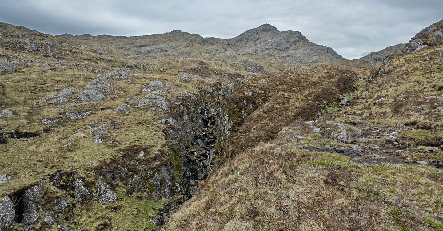 Wir laufen in einer kleinen Schlucht an einem Bachlauf entlang. Es ist kaum noch ein Pfad auszumachen. Als Orientierungshilfe kann man entlang des Bachlaufes gehen und bei guter Sicht hat man den Gipfel sowieso immer vor Augen. Wir erreichen schließlich 03 steileres Gelände (435 m).