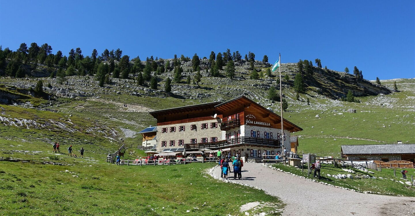 Wir gehen halb rechts, kommen an einem kleinen, dunkelgrünen See vorbei – oft weiden Kühe an seinen Ufern – und erreichen das heutige Etappenziel, die 05 Lavarella-Berghütte (2.050 m).