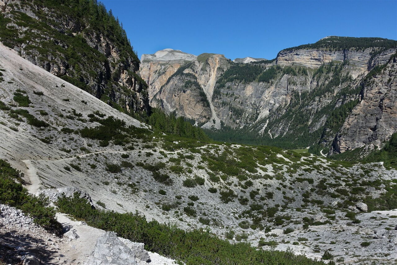 Vom 01 Berggasthaus Pederü (1.545 m) gehen wir ca. 100 m auf dem Kieselsteinweg (Wanderweg 7) in südliche Richtung, bevor wir den Bachlauf über eine Brücke queren. Dahinter gehen wir links und marschieren durch Latschenkiefern bergauf, weiterhin auf einem Kieselsteinweg. Zwischenzeitlich überqueren wir eine Schotterpiste, die bis in das Hochtal des Fanes-Sennes-Prags-Naturparks führt. Alternativ kann man auch auf der Schotterpiste bergauf gehen, die nachfolgende Beschreibung gilt für den kürzeren und schöneren Wanderweg. Der nachfolgende Pfad ist mit Holzpfosten befestigt, da der komplette Hang abgerutscht war.